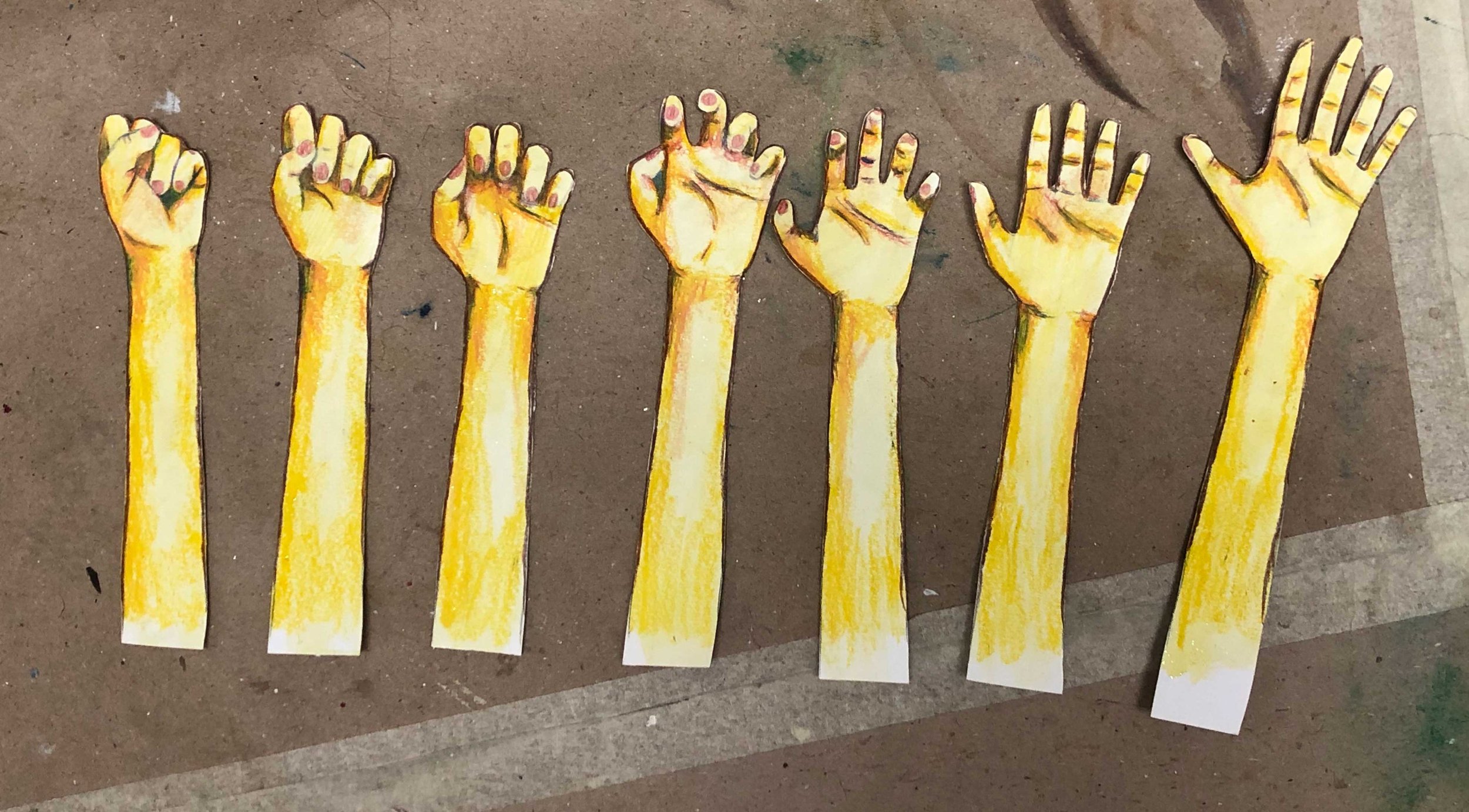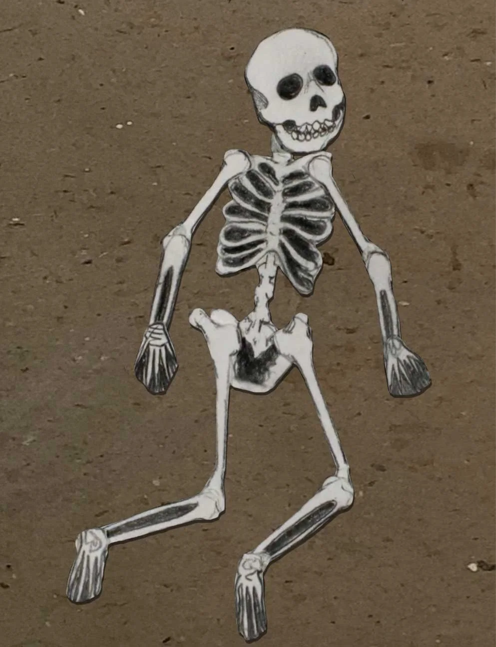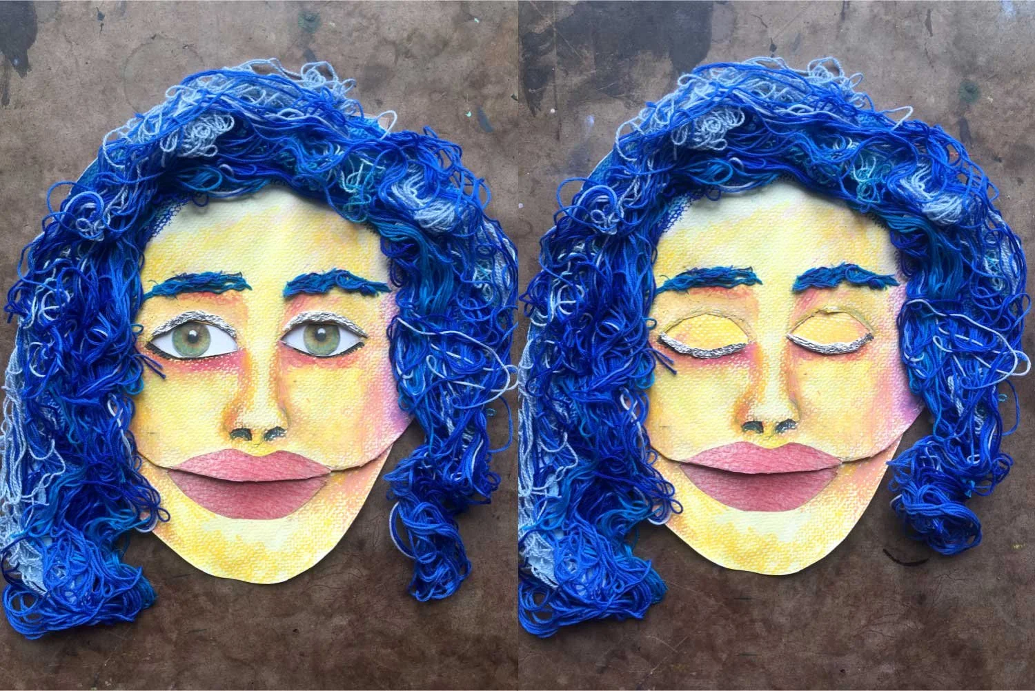 Girl & skeleton puppets: Paper cut-out puppets, colored pencil/wax pastels on paper, thread, sticky tack; Girl head puppet: Moveable eyelid tab on back for blinking, colored pencil/wax pastels on paper, aluminum foil, thread