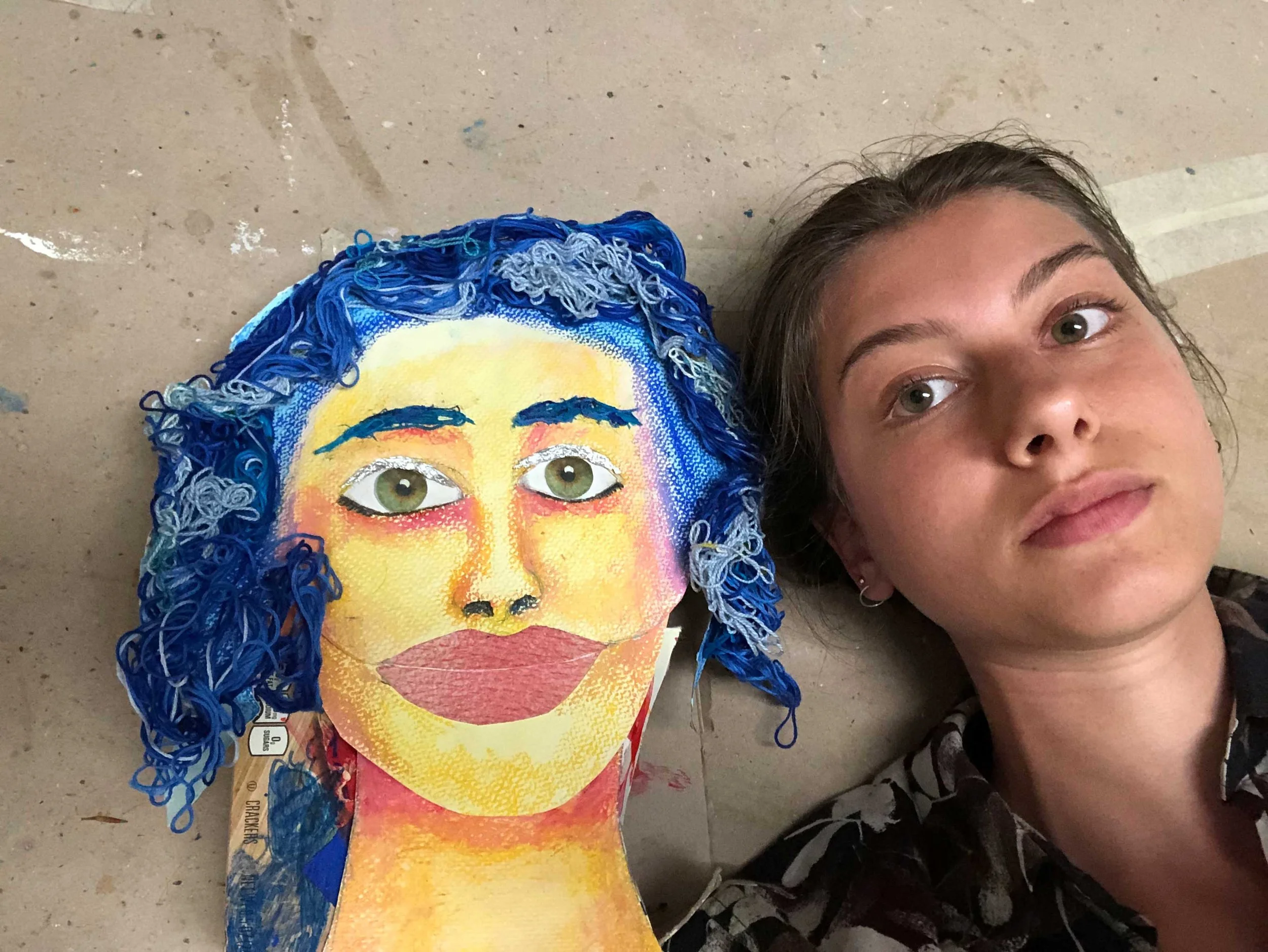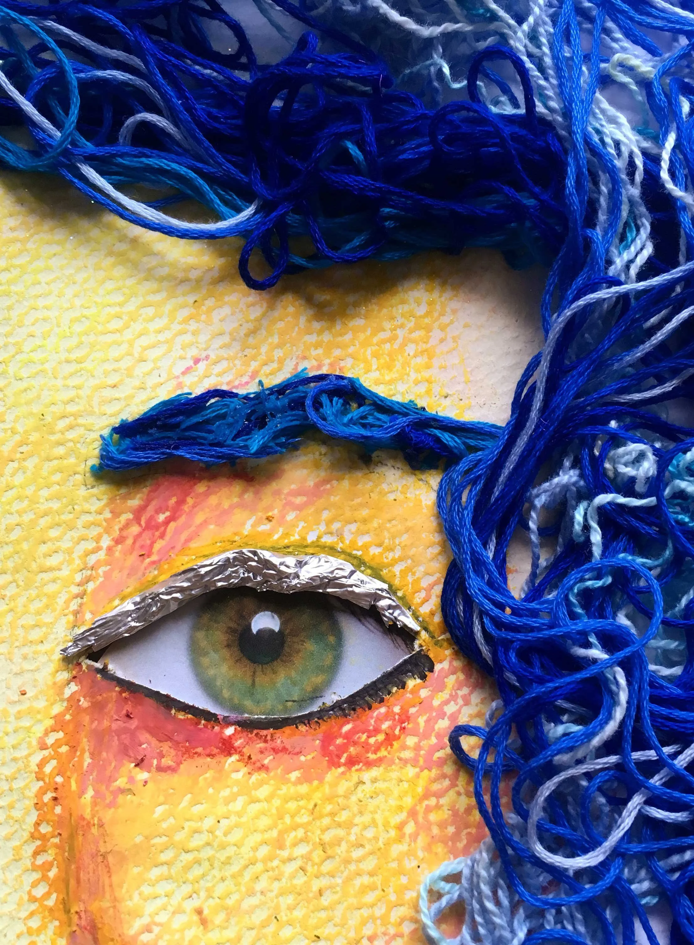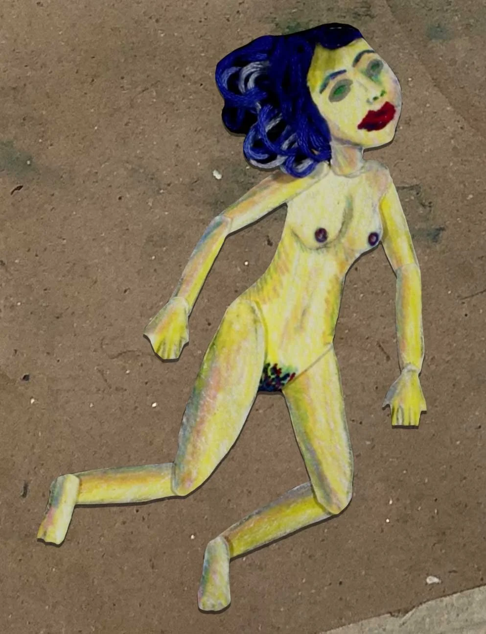 Girl & skeleton puppets: Paper cut-out puppets, colored pencil/wax pastels on paper, thread, sticky tack; Girl head puppet: Moveable eyelid tab on back for blinking, colored pencil/wax pastels on paper, aluminum foil, thread