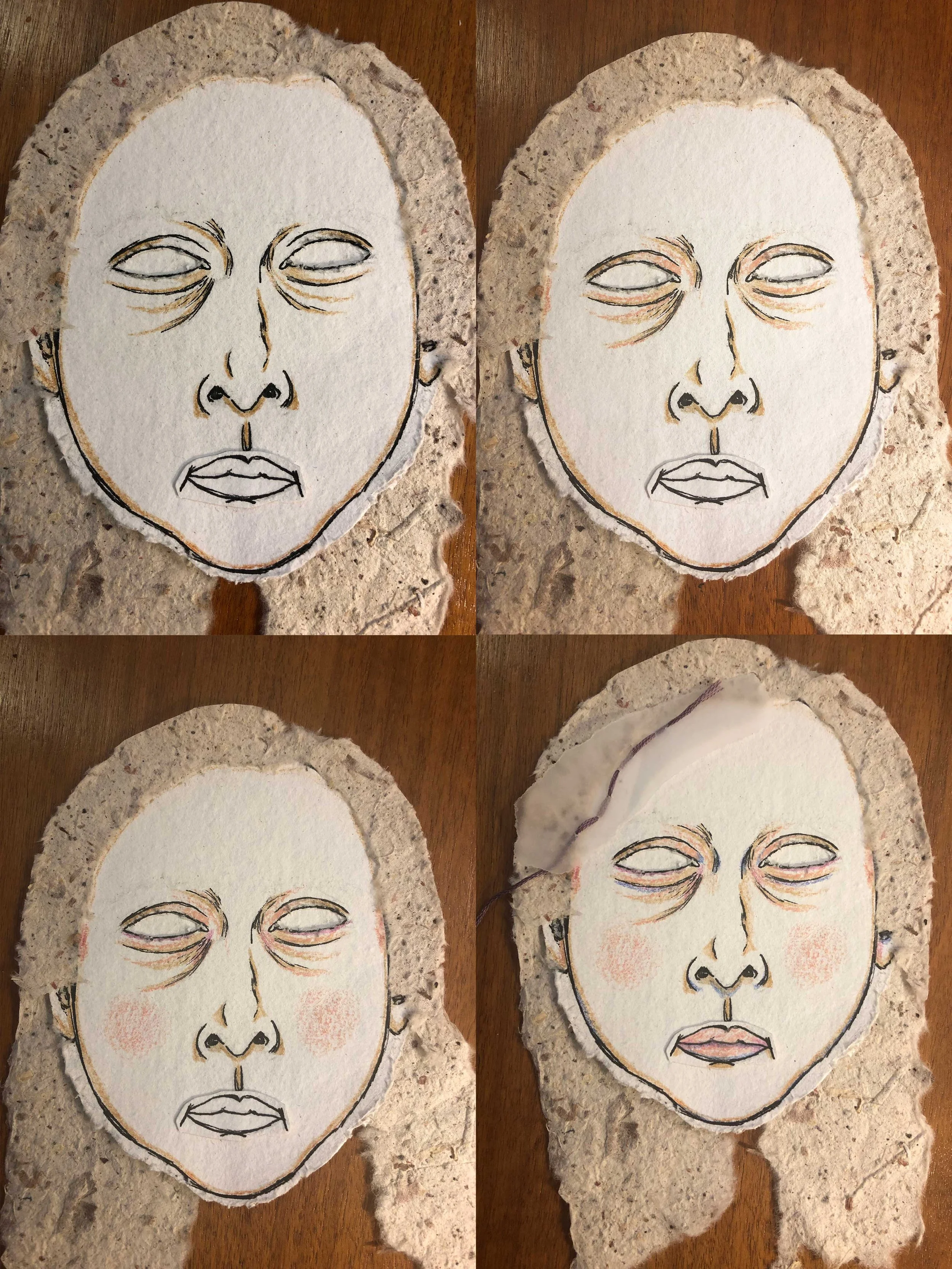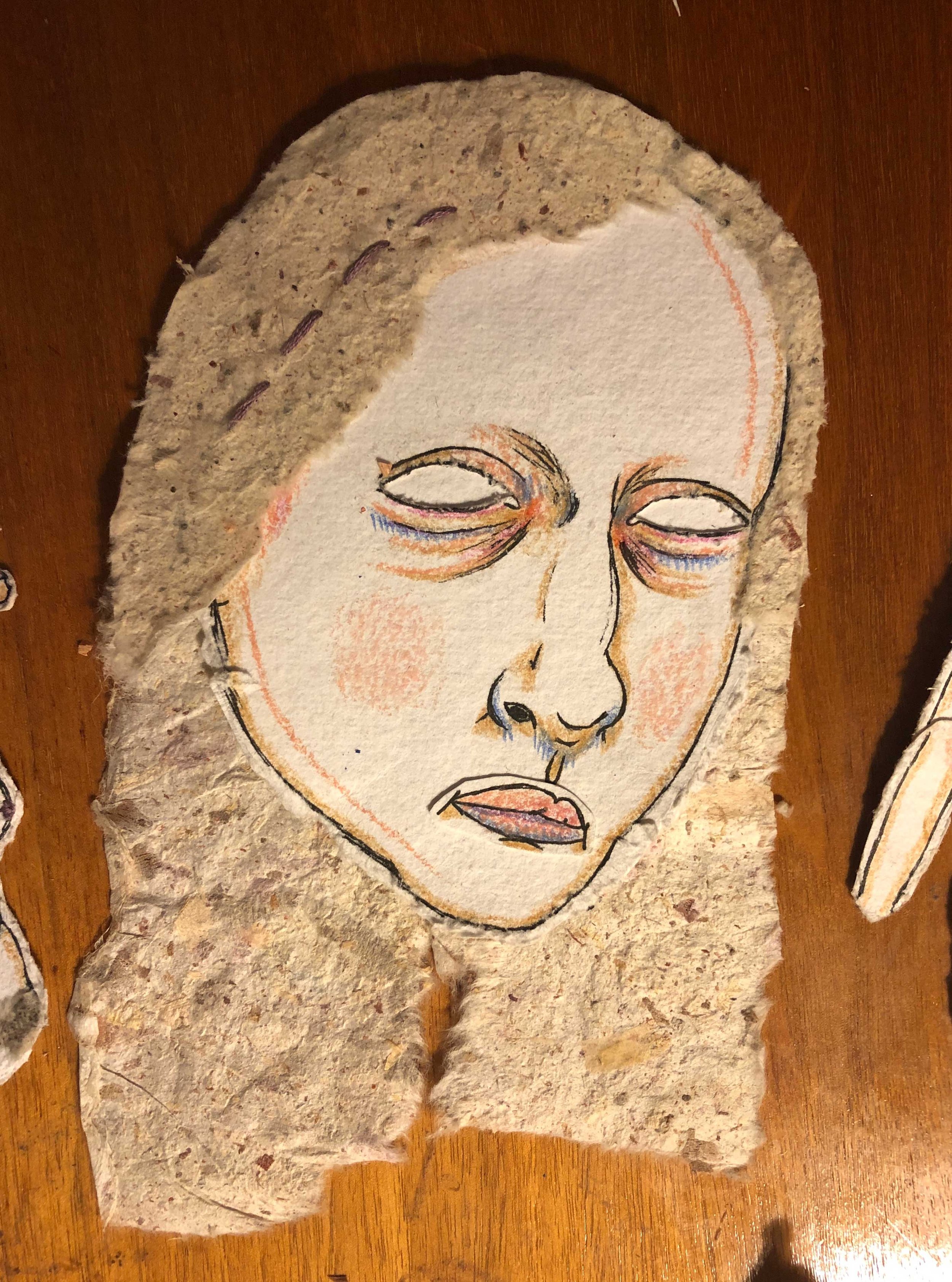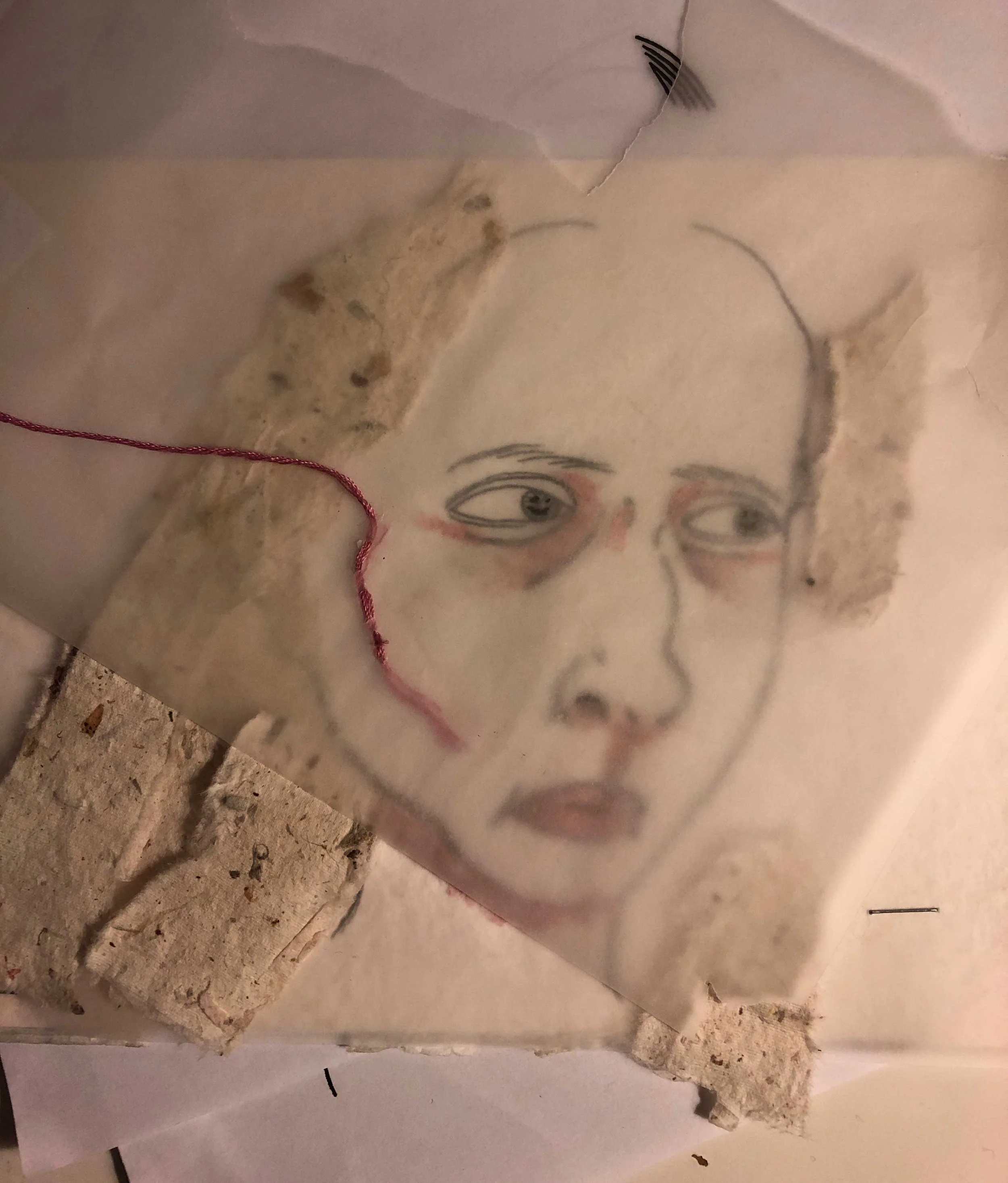 Coloured pencil on mixed-media paper, embroidery thread, handmade paper