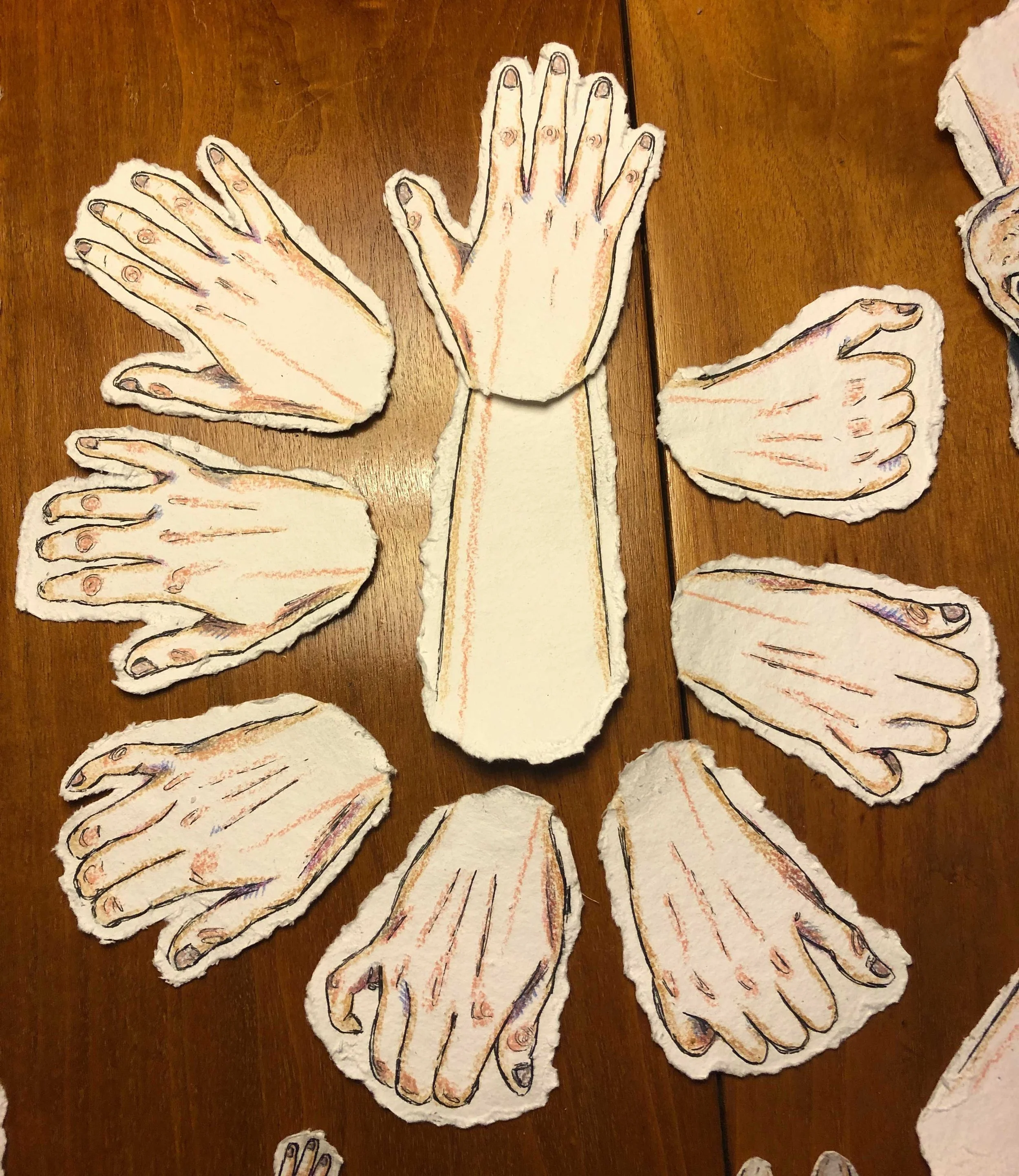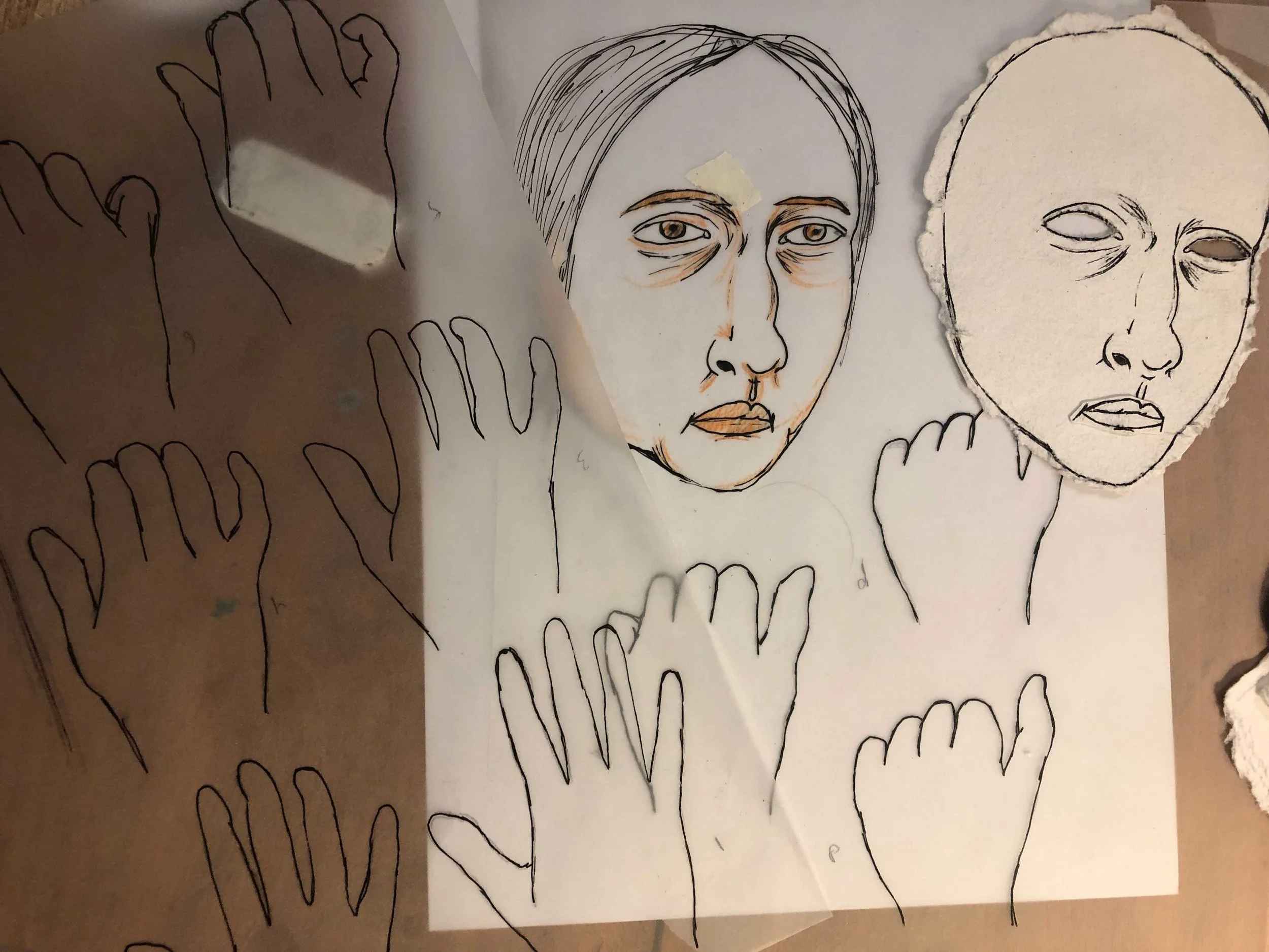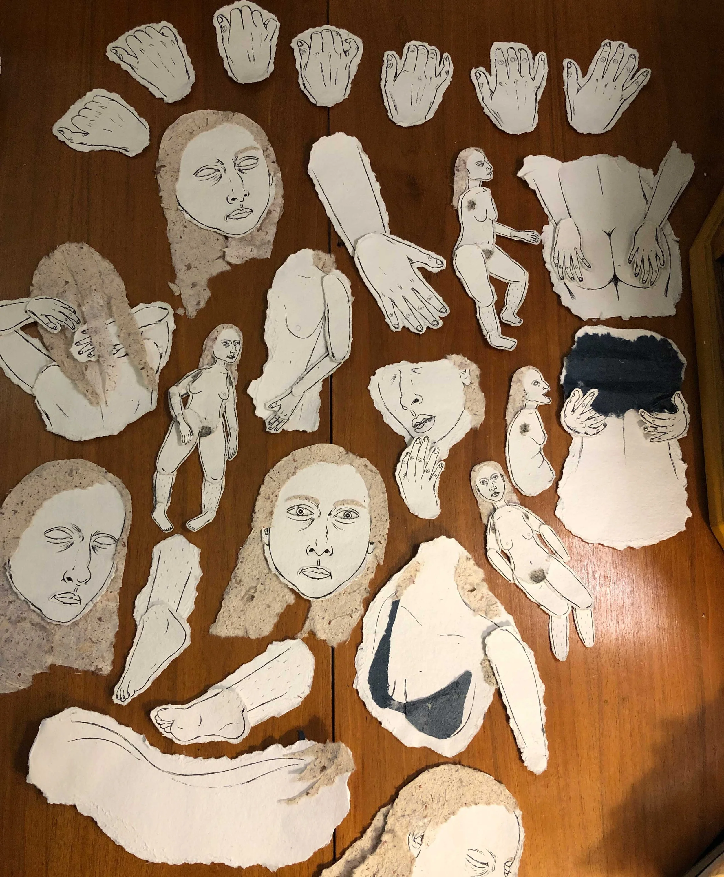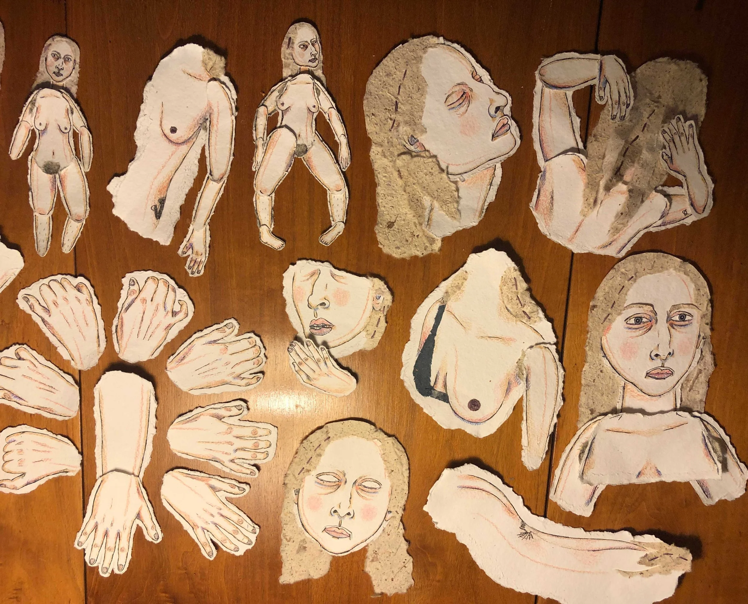 Coloured pencil on mixed-media paper, embroidery thread, handmade paper