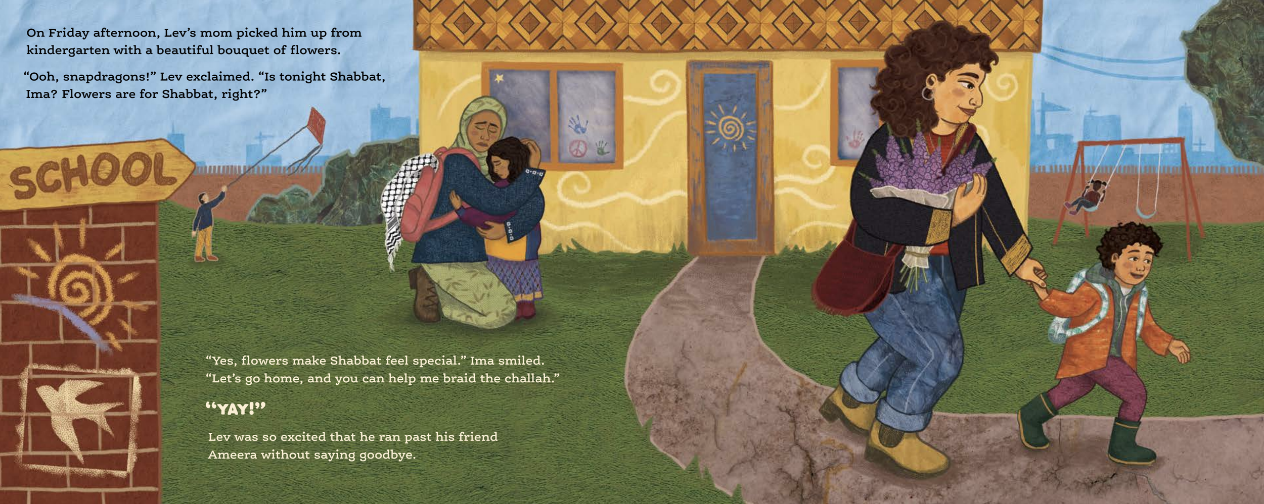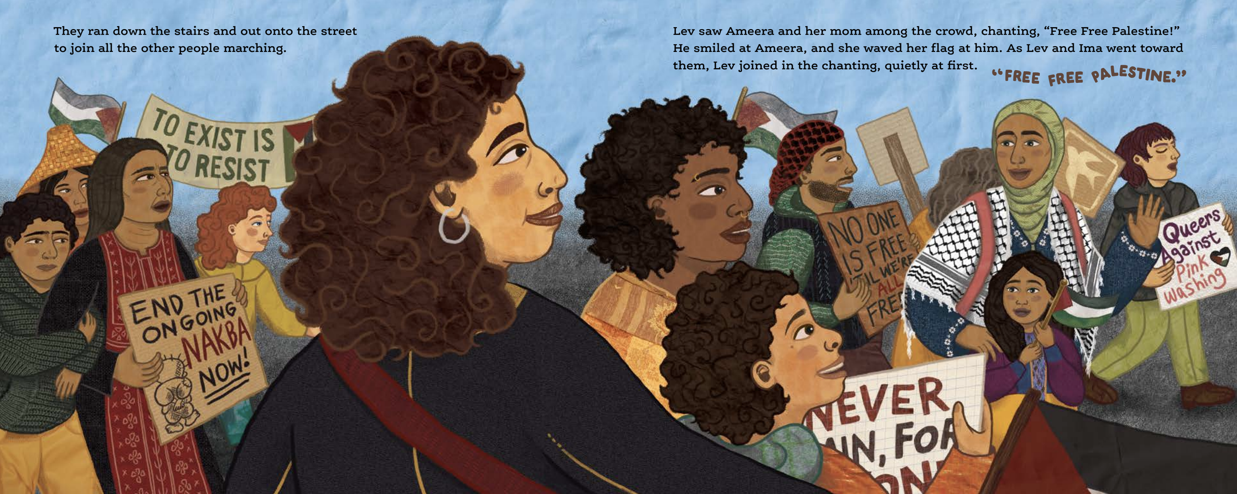 When Lev sees a crowd including his friend Ameera marching for Palestine on the street outside his window, he asks Ima if they are speaking out for people being treated unfairly, just like Bubbie. Inspired by Lev's care and bravery, Ima takes him outside to join the march for Palestinian justice and the principle "never again, for anyone."