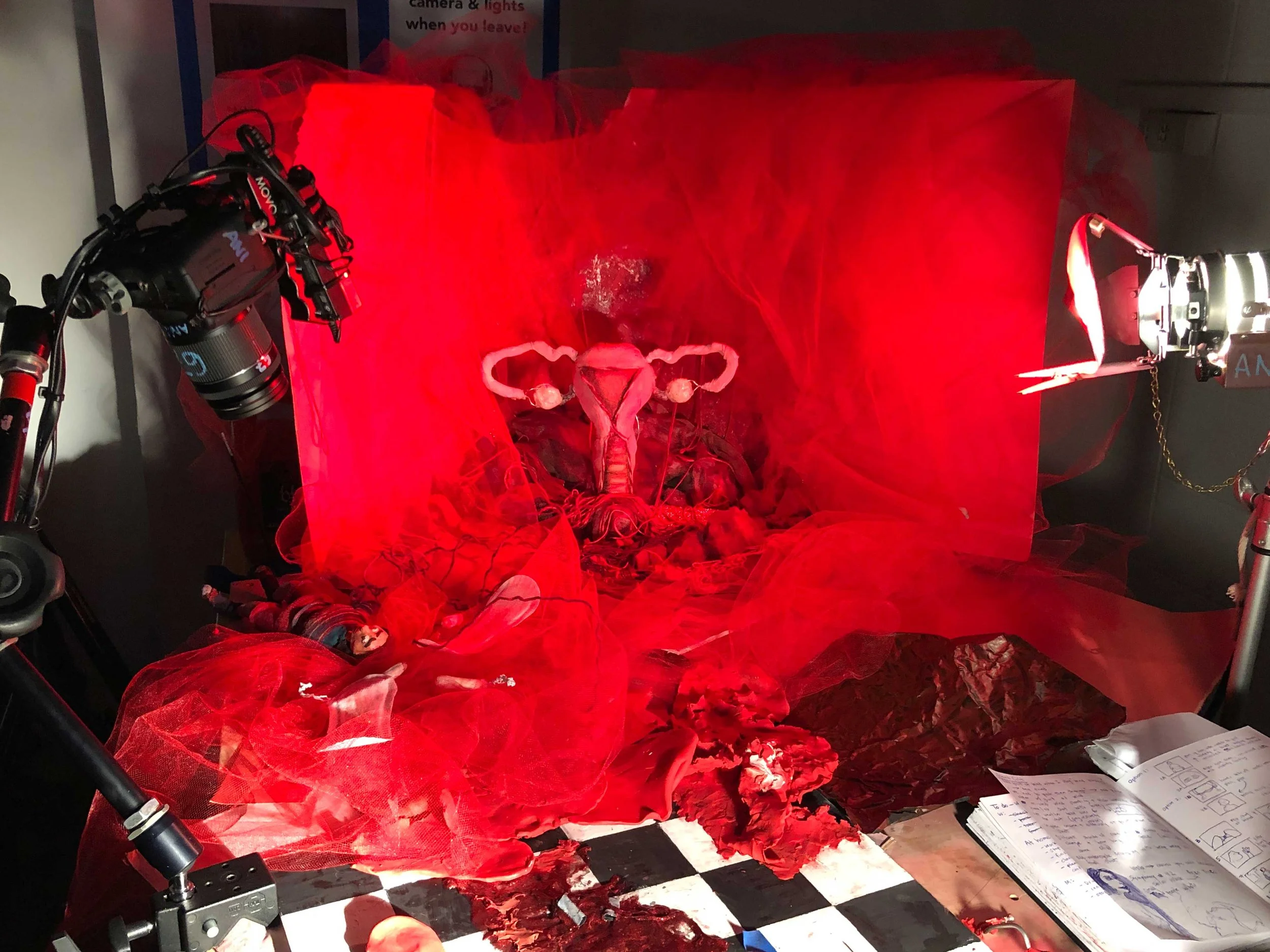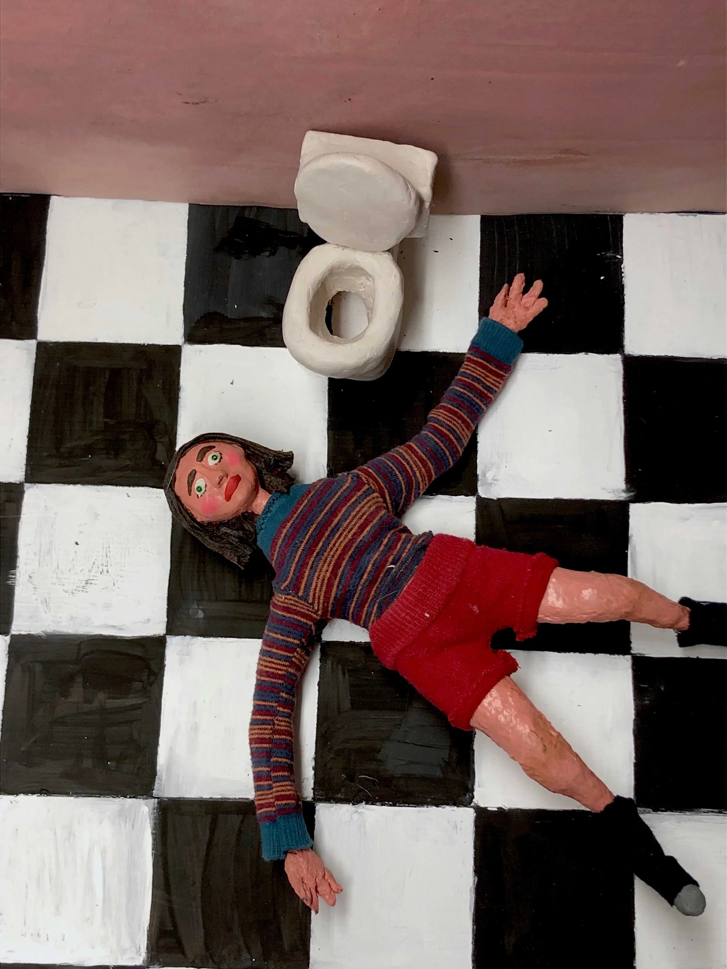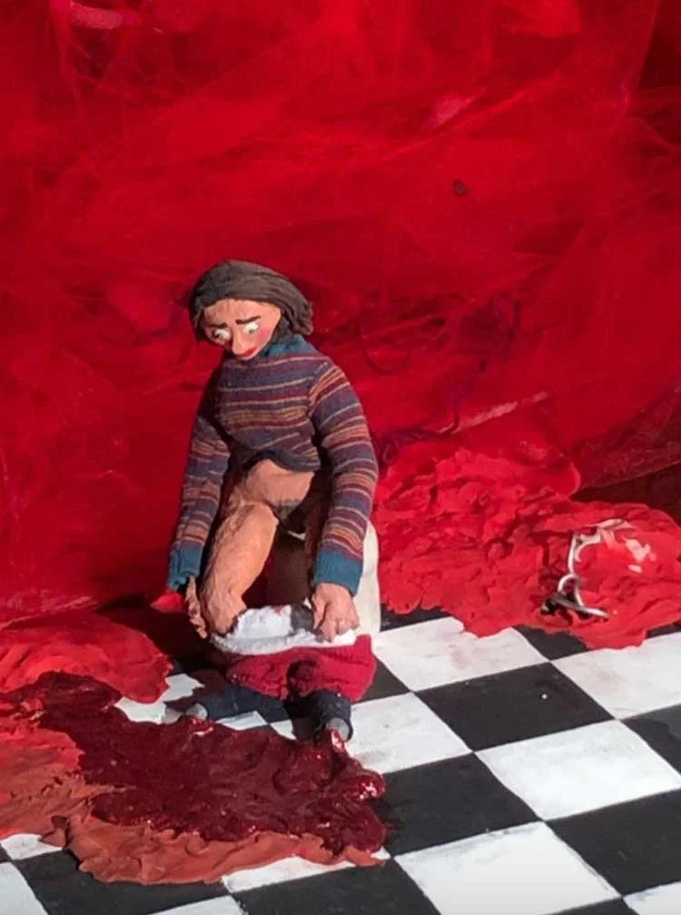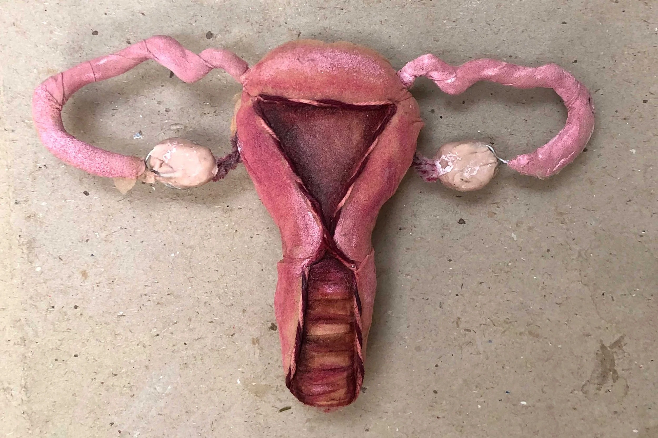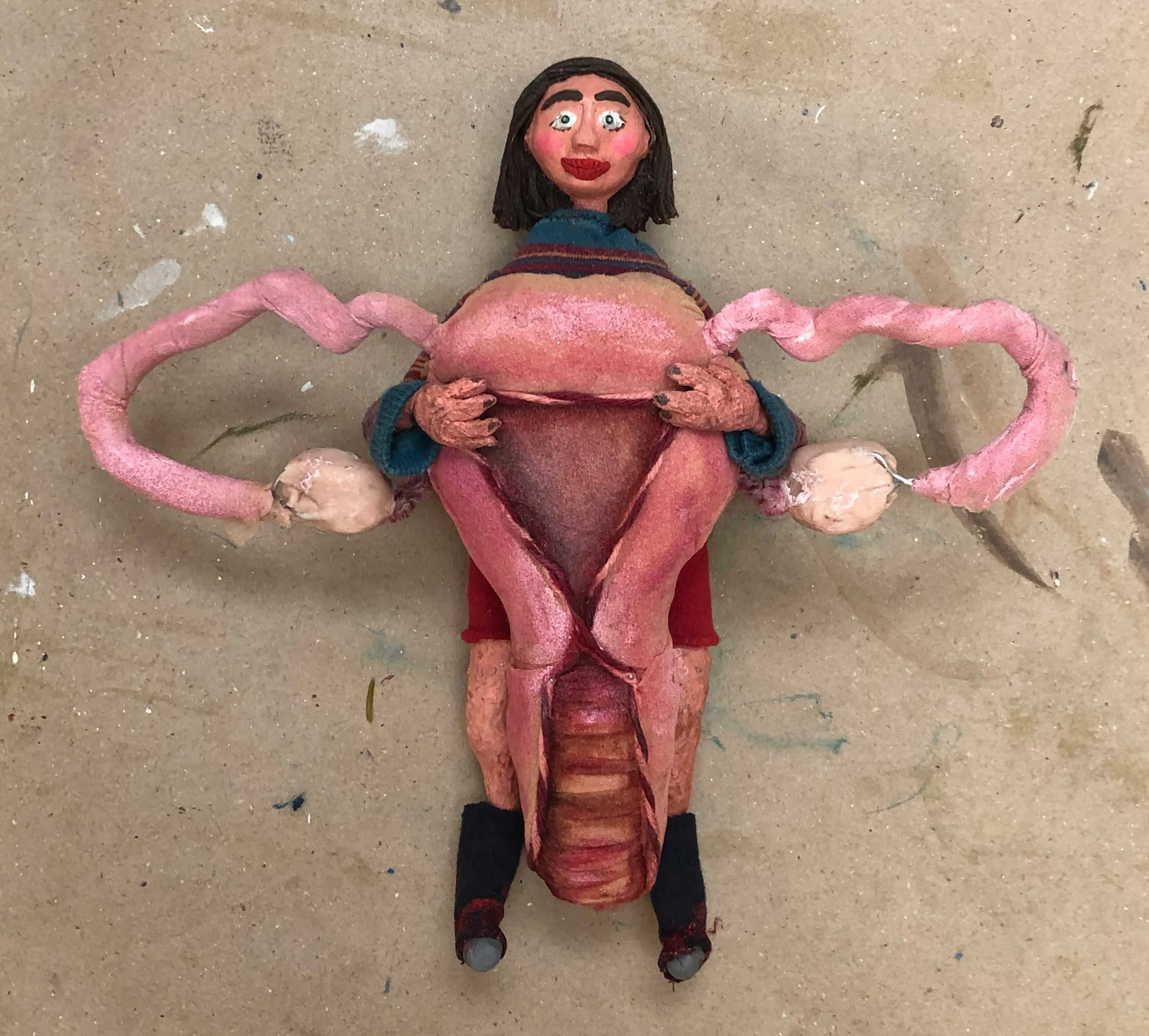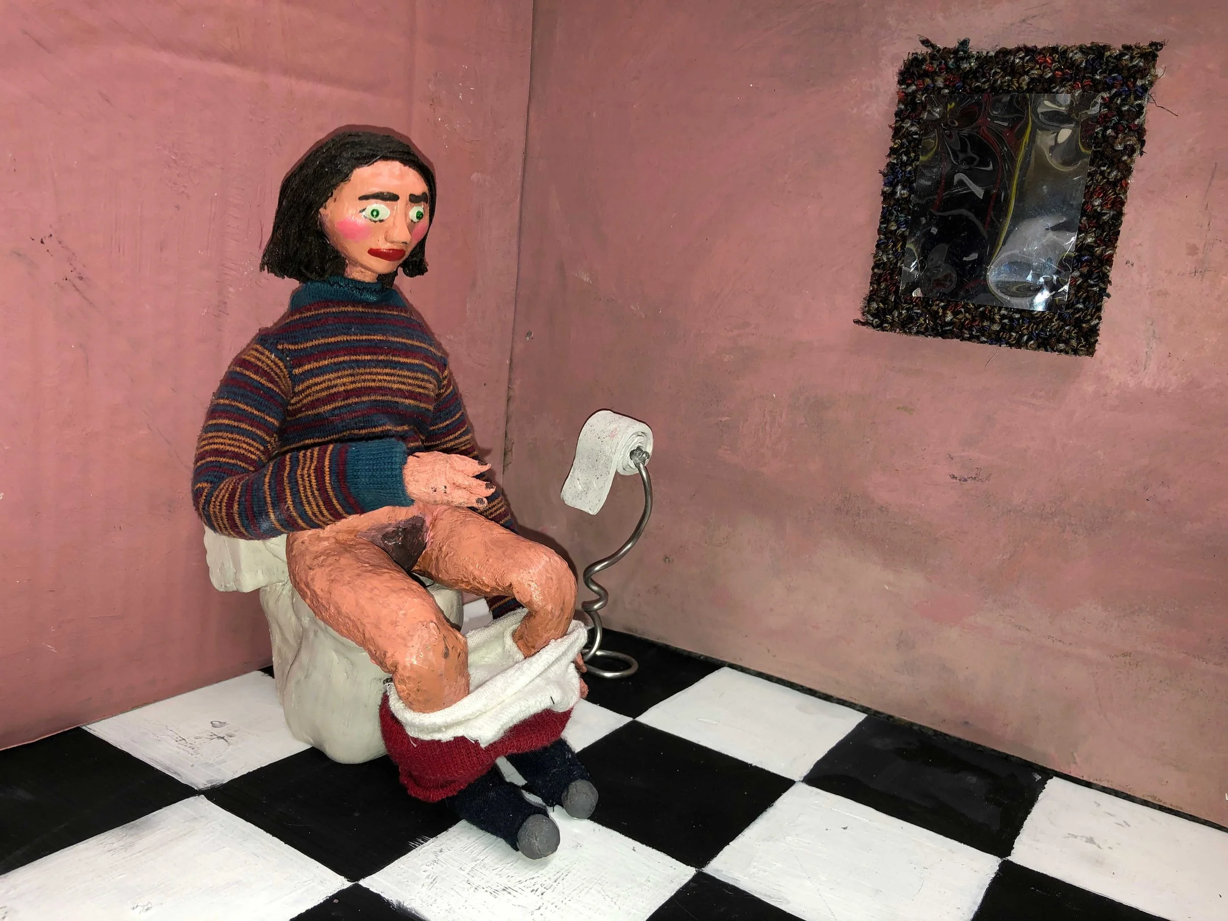 Uterus: foam, cotton, thread, toilet paper, fabric, fake blood & acrylic; Bathroom set: cardboard & acrylic