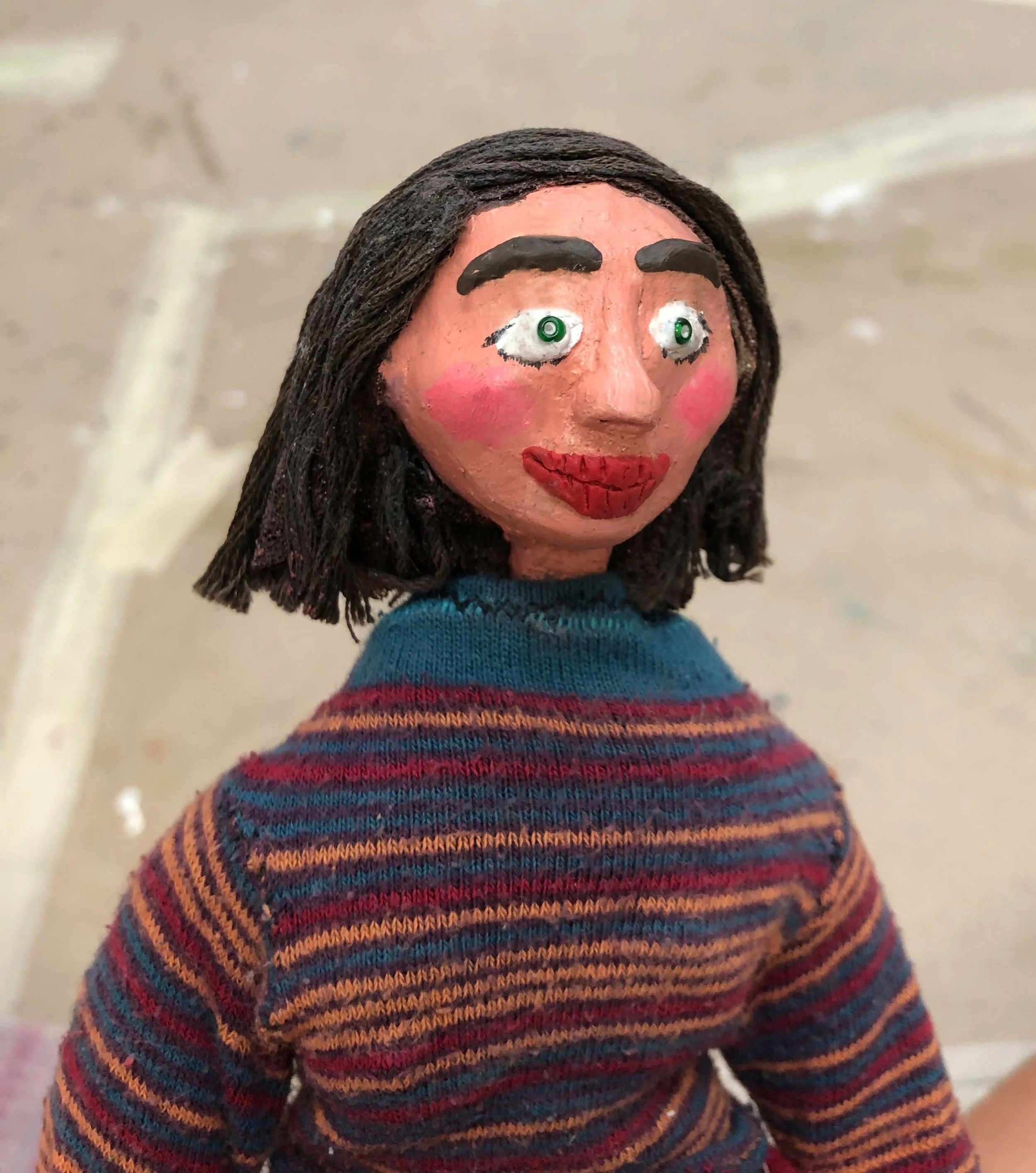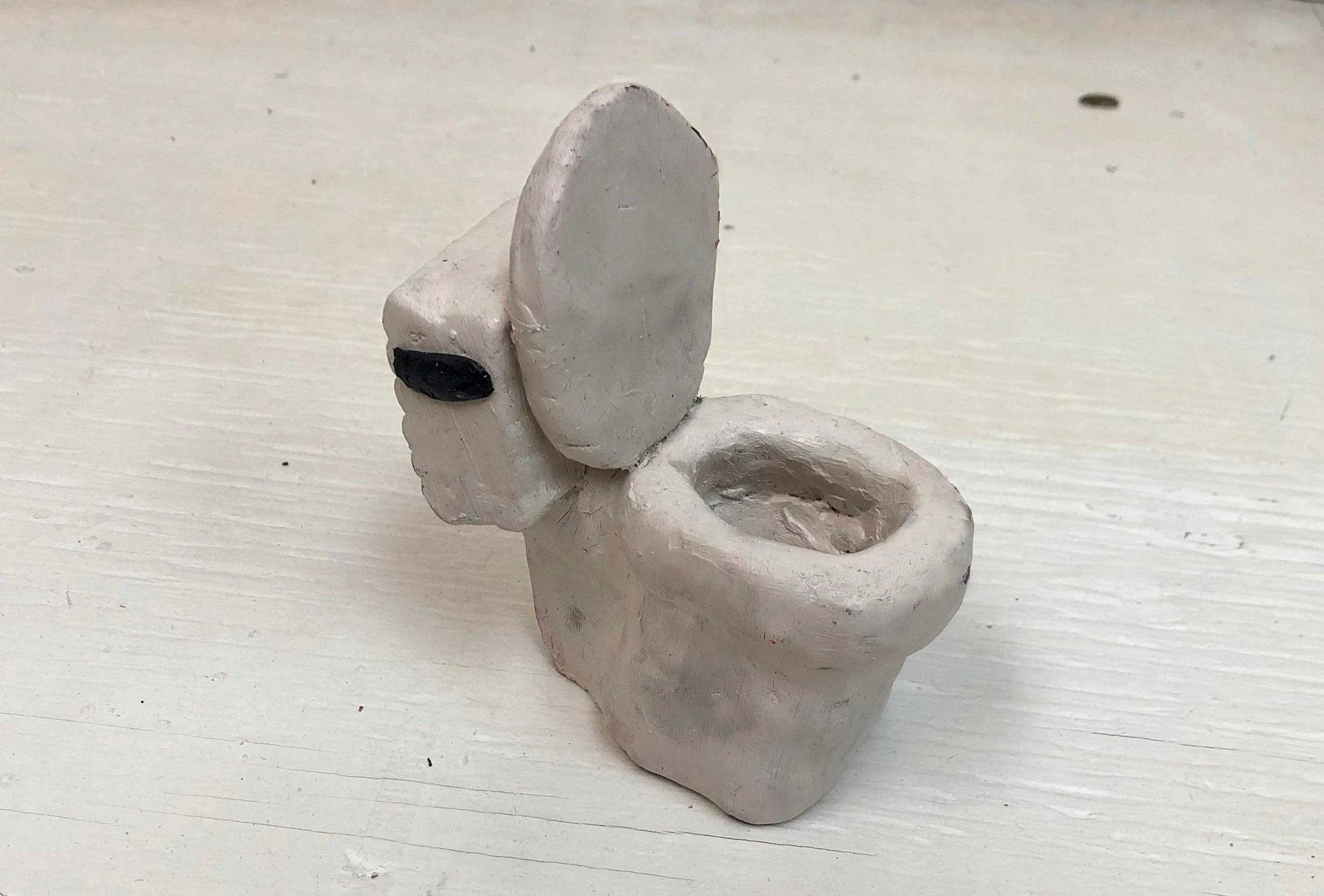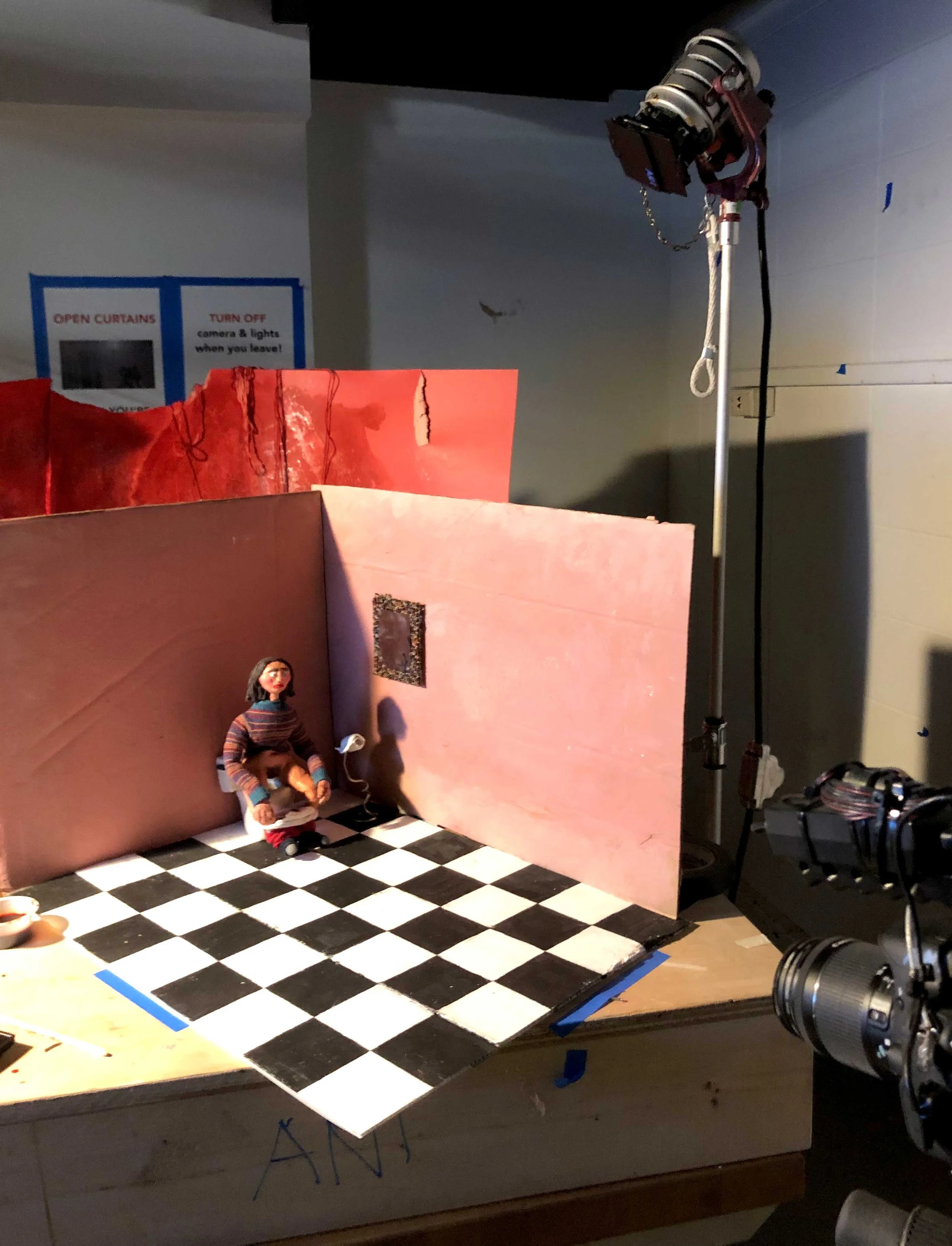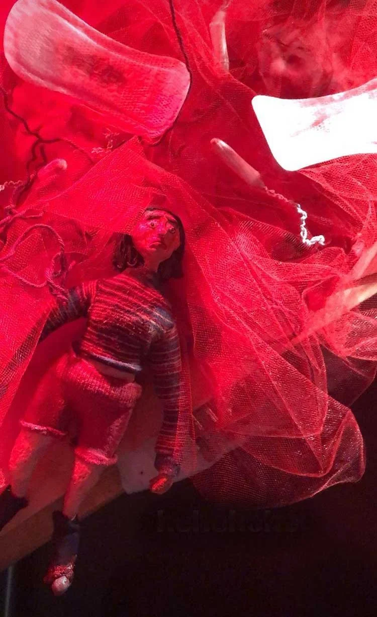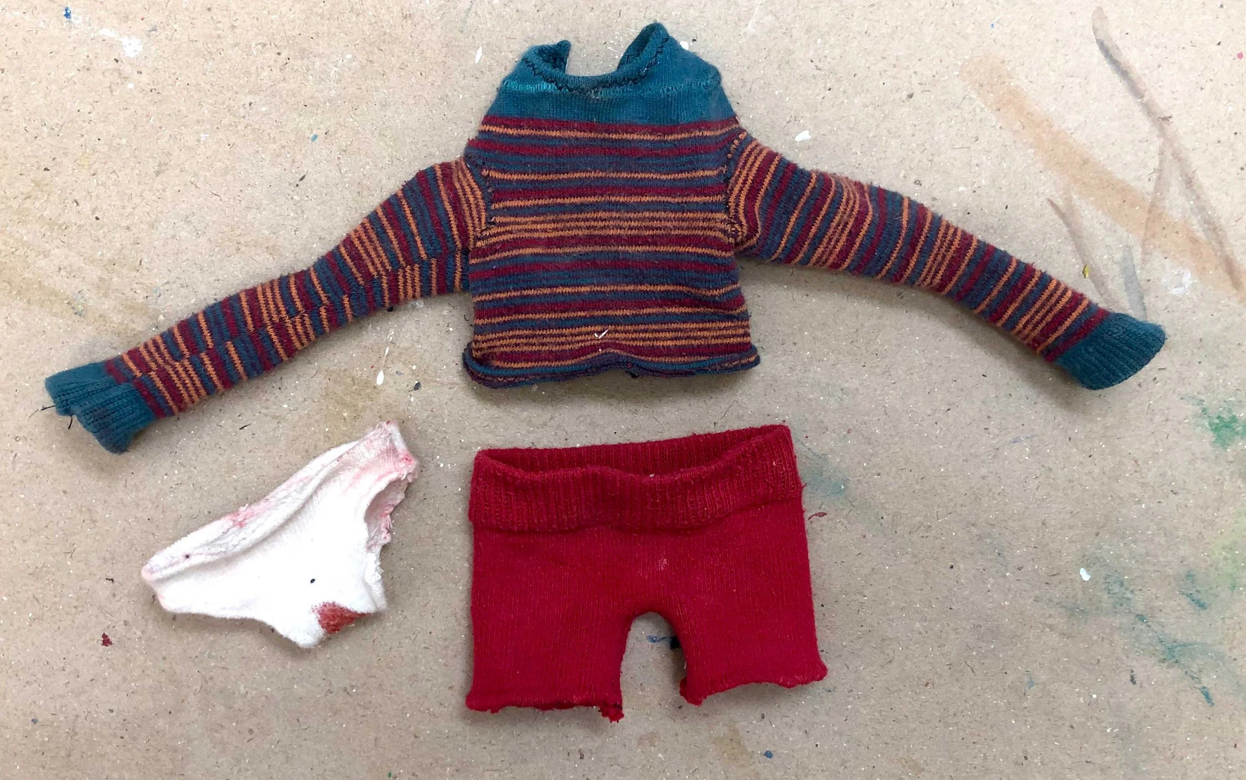 Uterus: foam, cotton, thread, toilet paper, fabric, fake blood & acrylic; Bathroom set: cardboard & acrylic