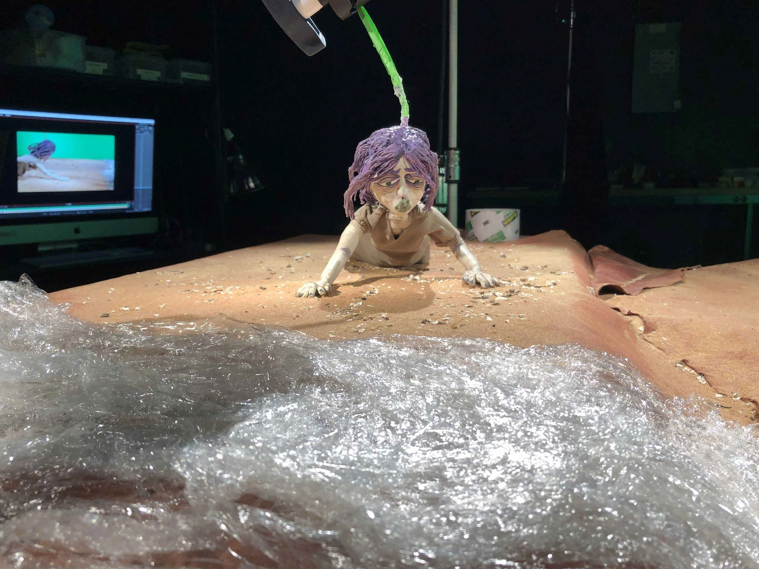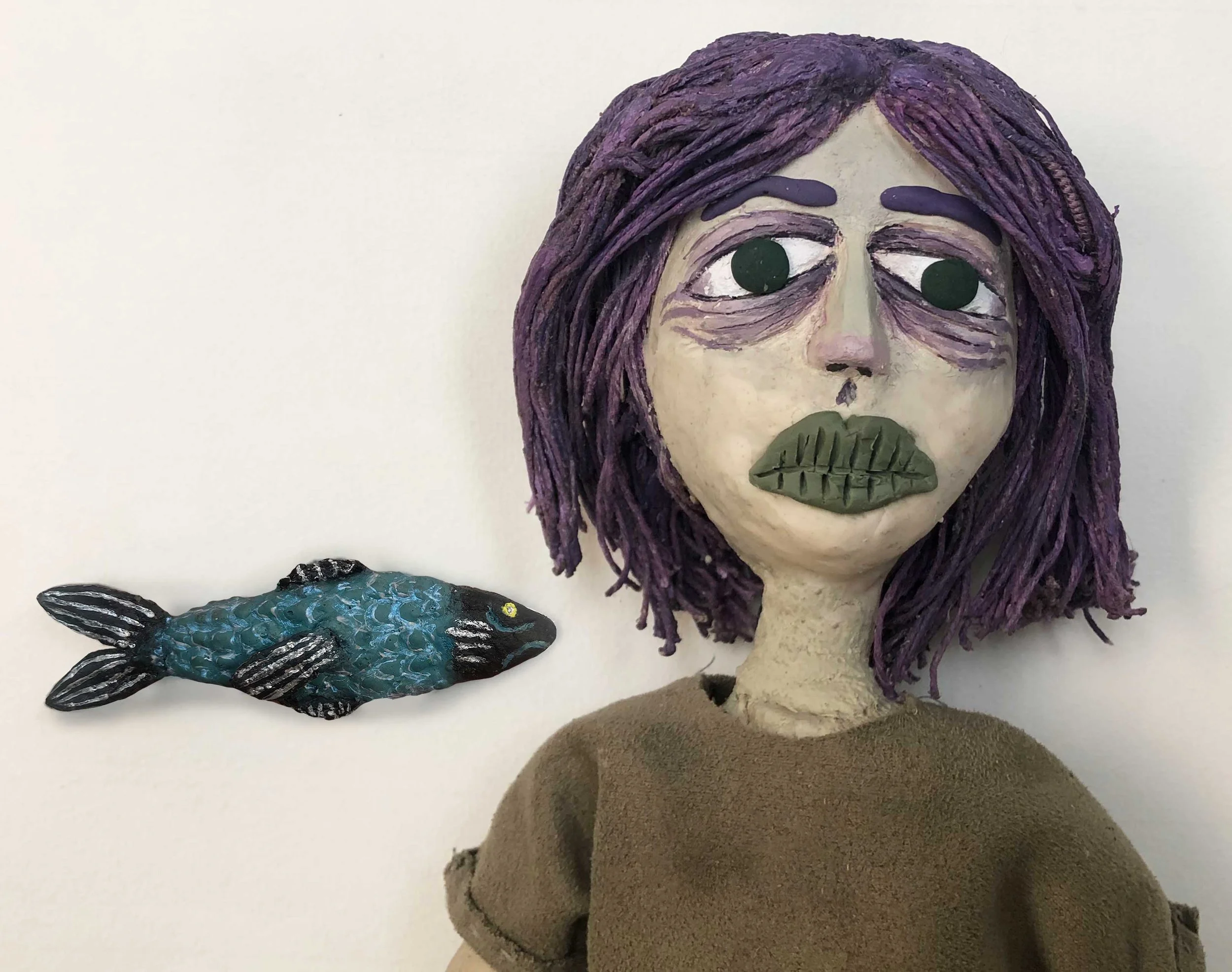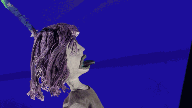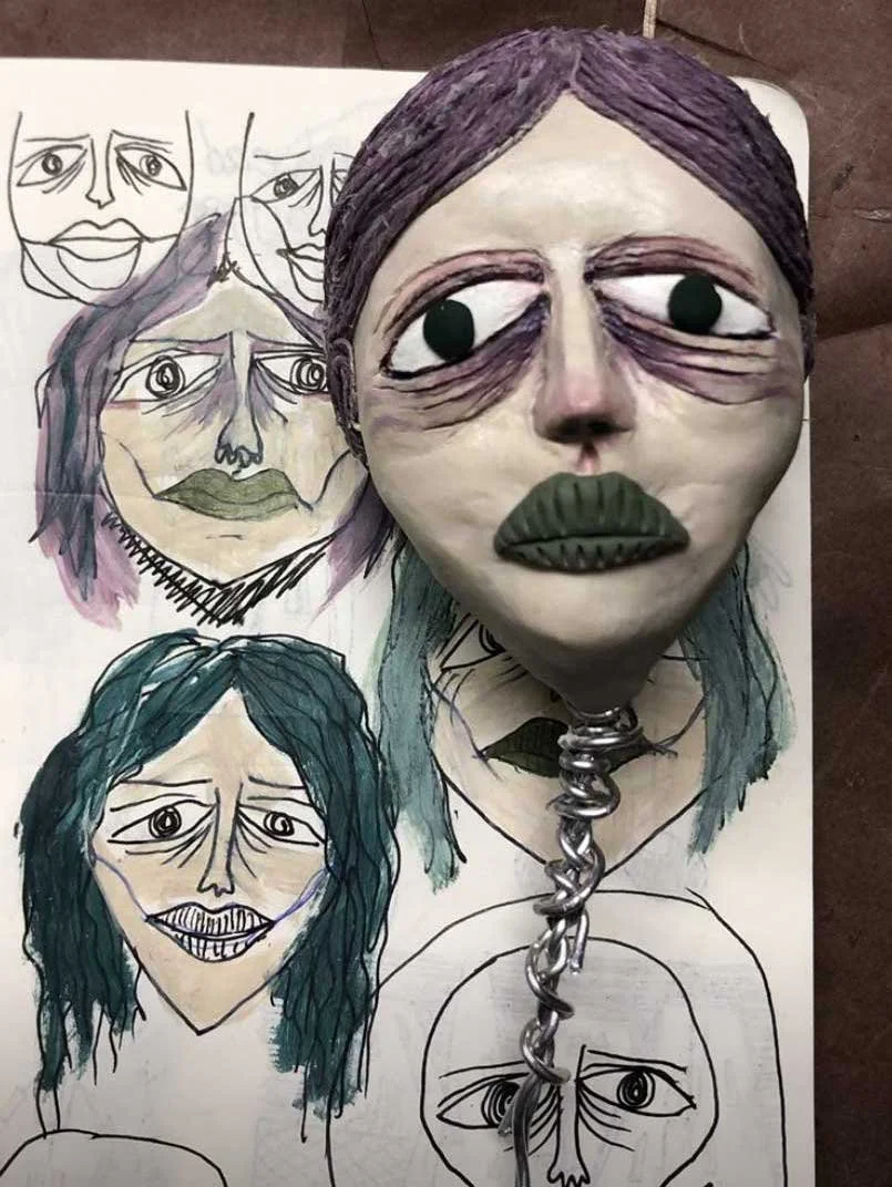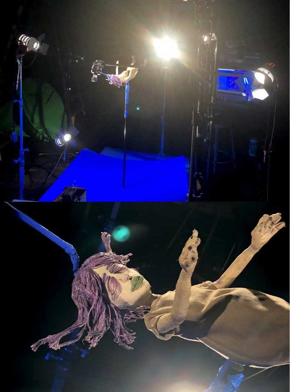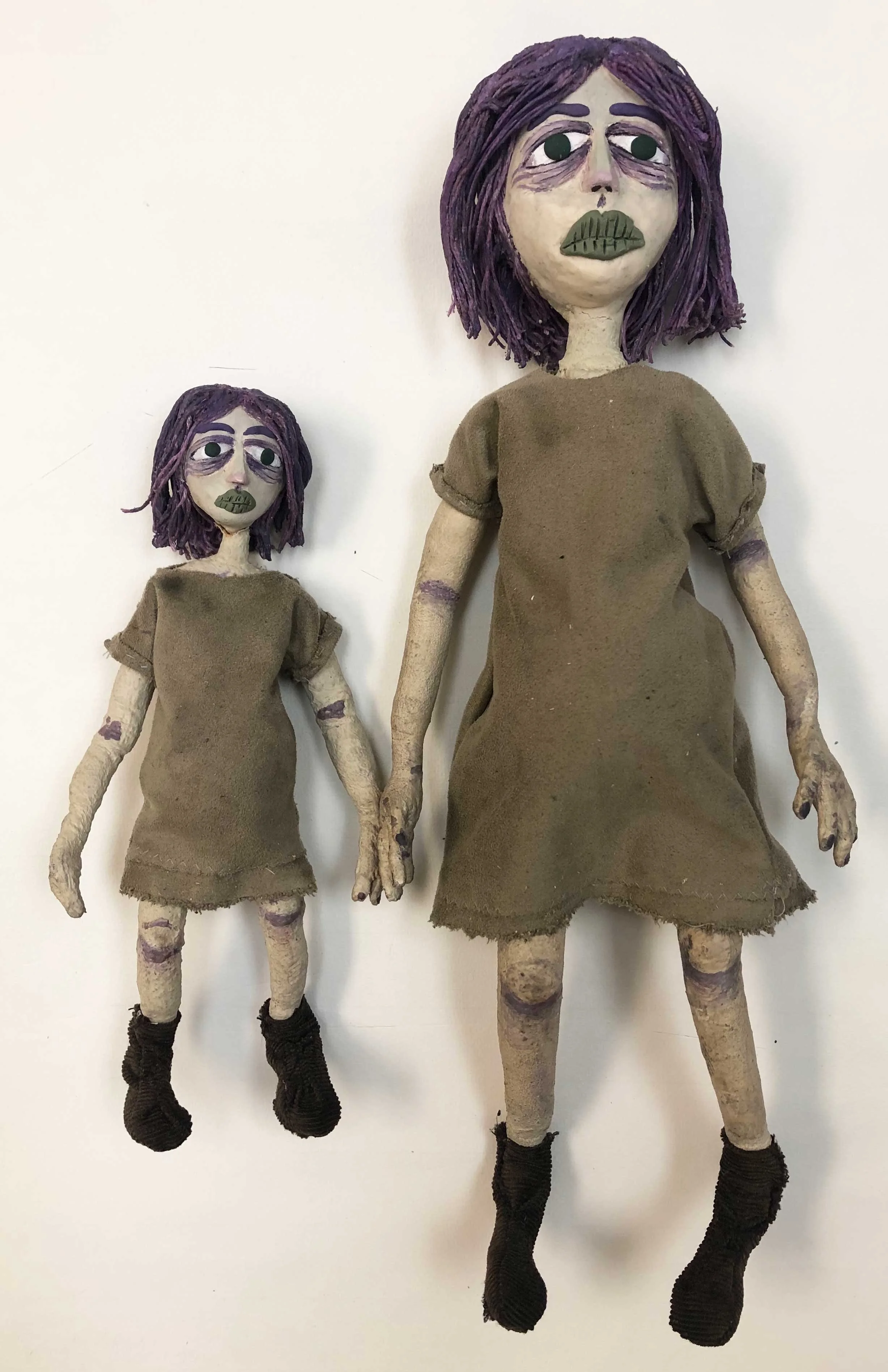Woman Puppet: Wire armature, build up foam, bandages, latex, ProsAid & Acrylic skin, baked Sculpey head, soft sculpey jaw for movement, plasticine lips, eyebrows, pupils
