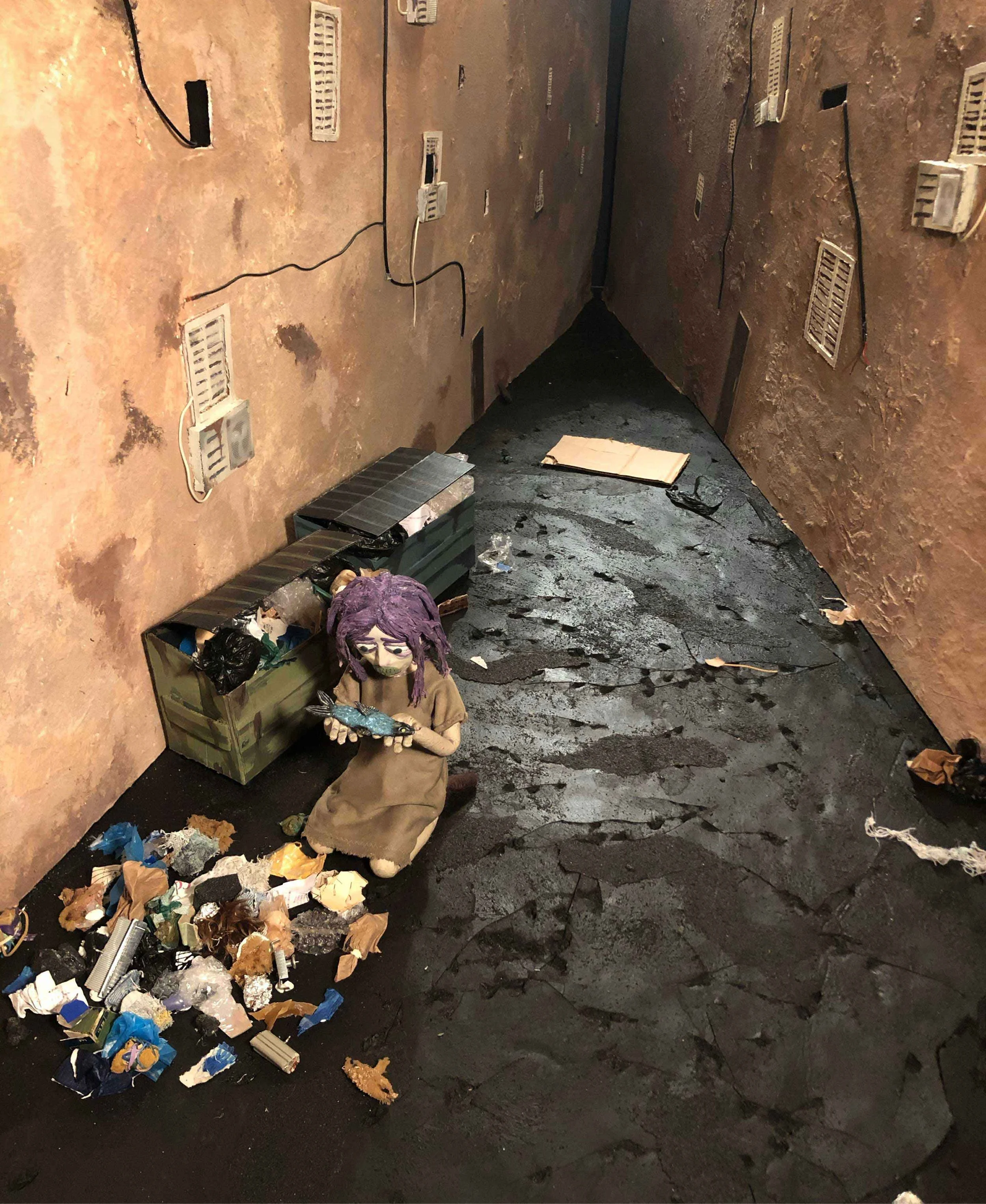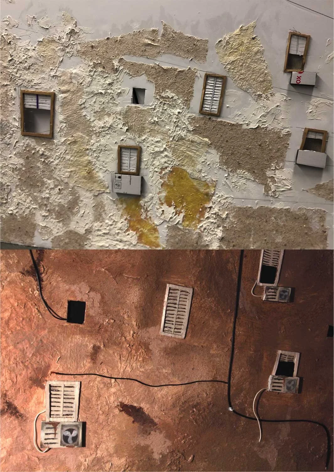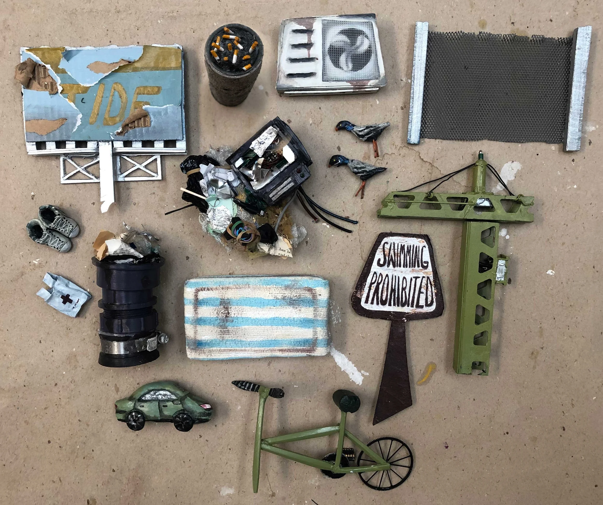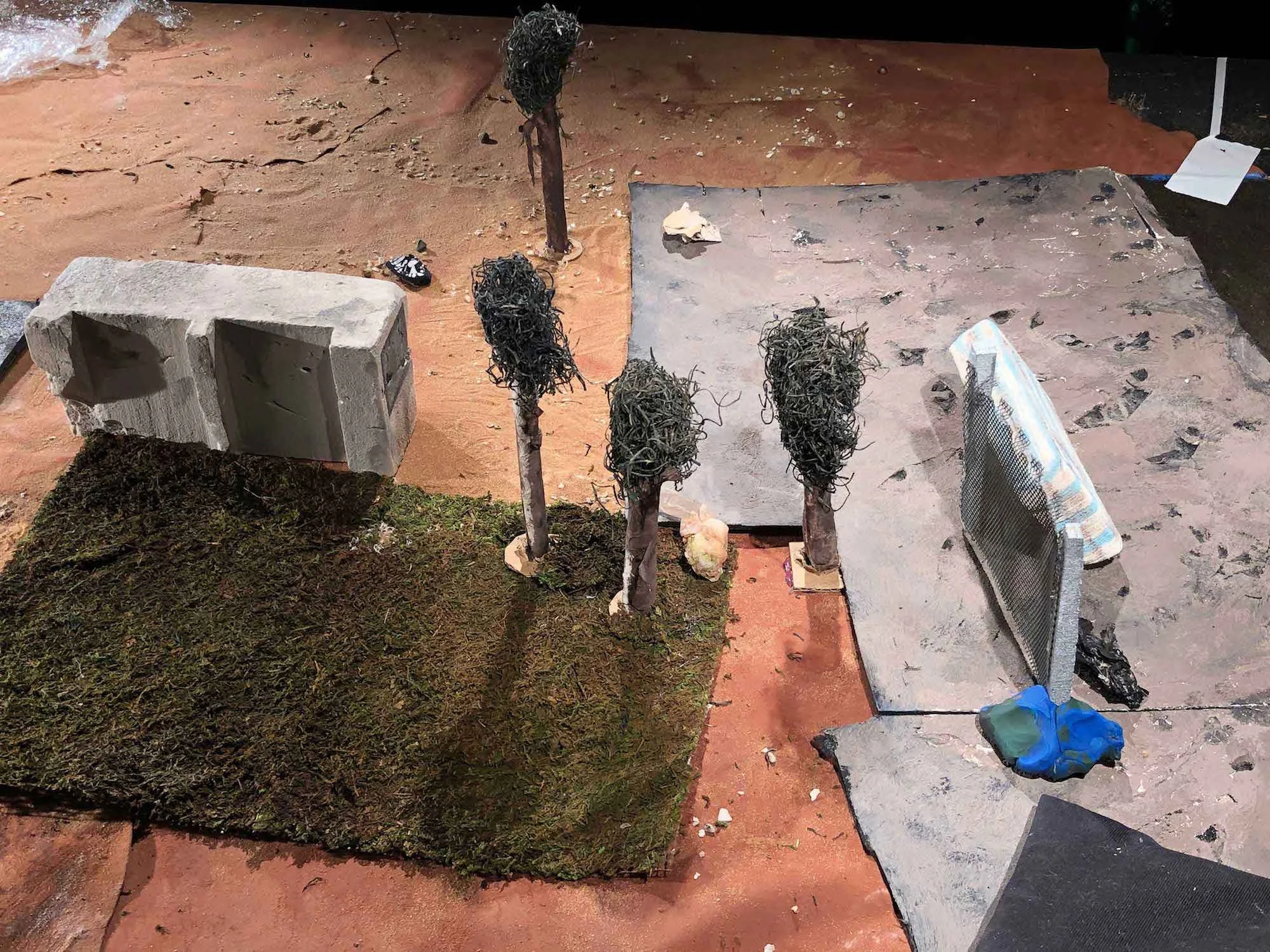 SETS - Alleyway (32x80"): joint compound, handmade paper, sand + plaster + concrete texture medium & acrylic on foam core for pavement; Beach: leather & sand for shore, plastic wrap for water
