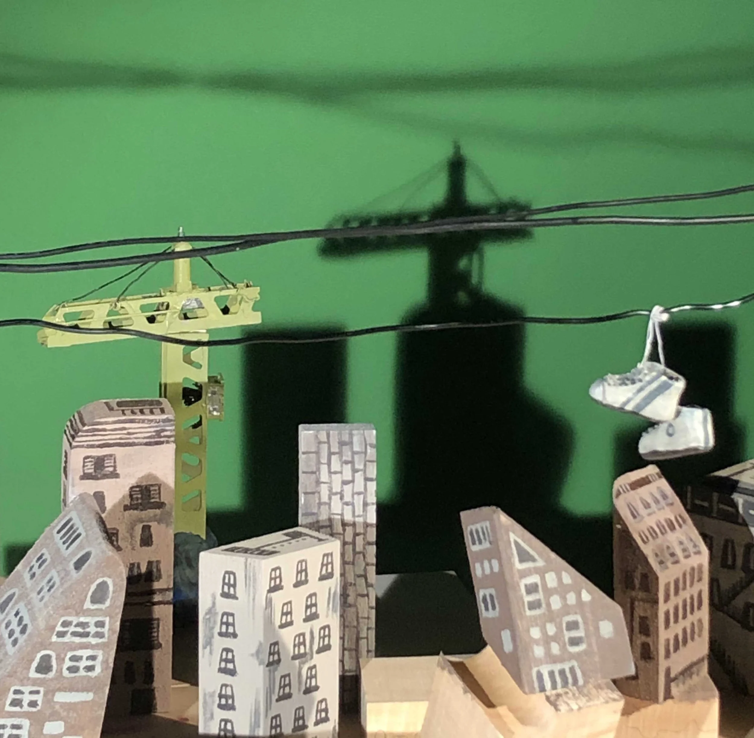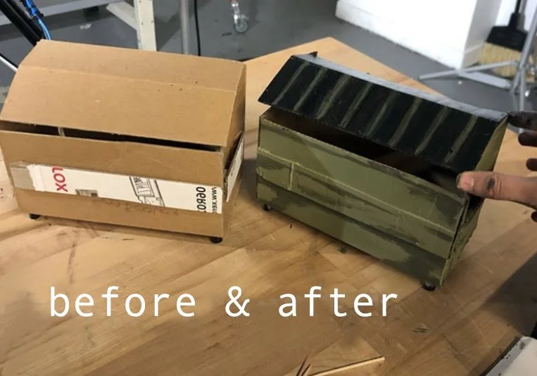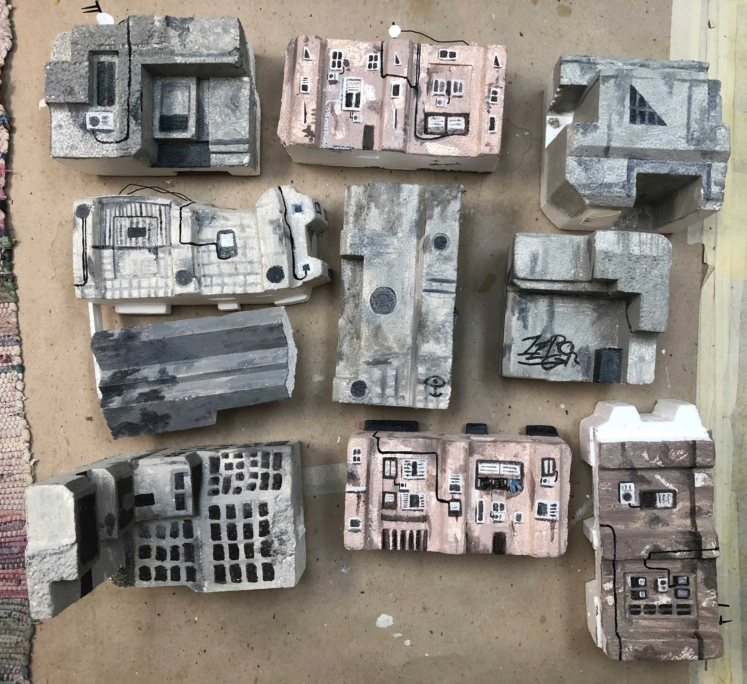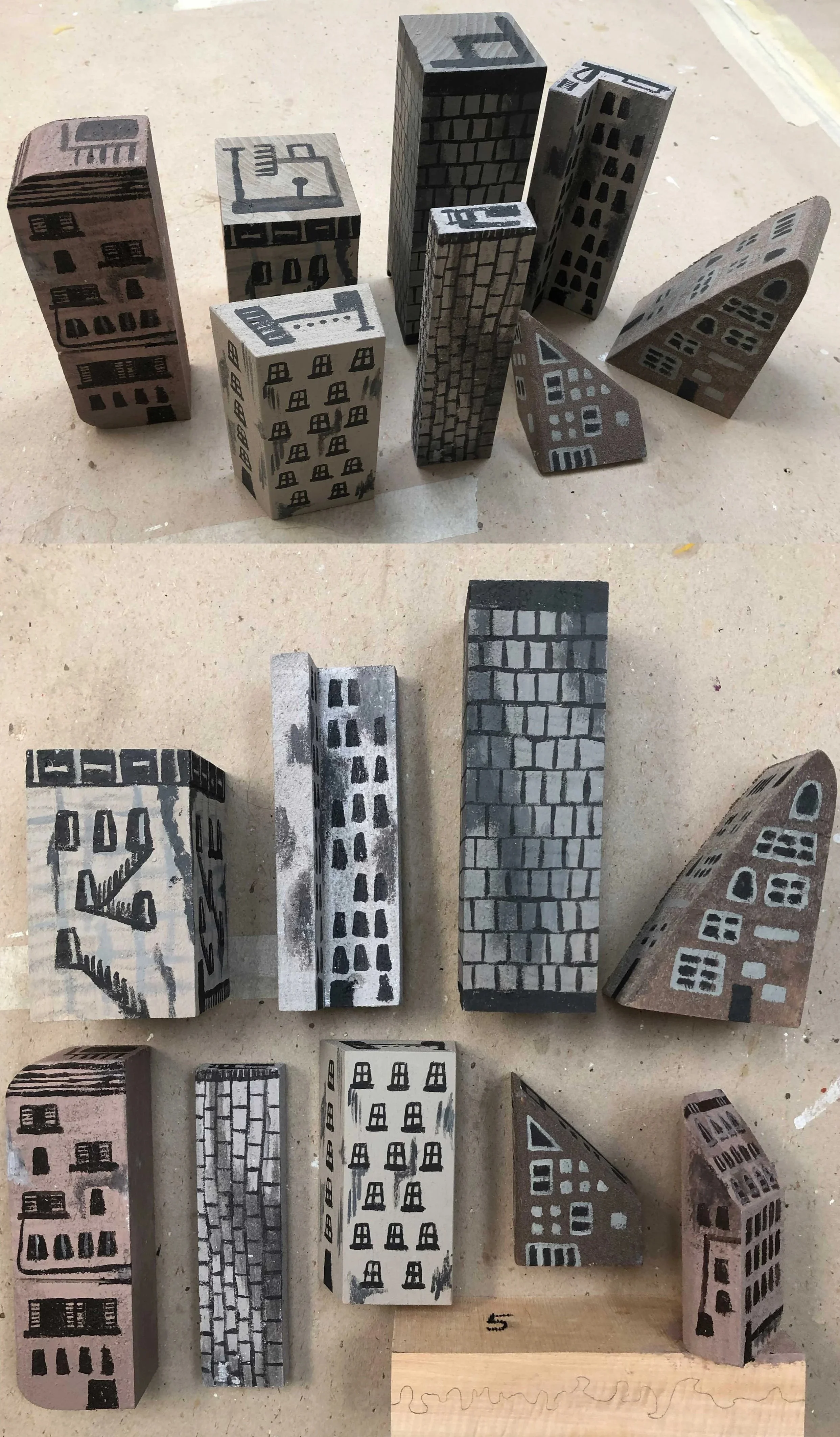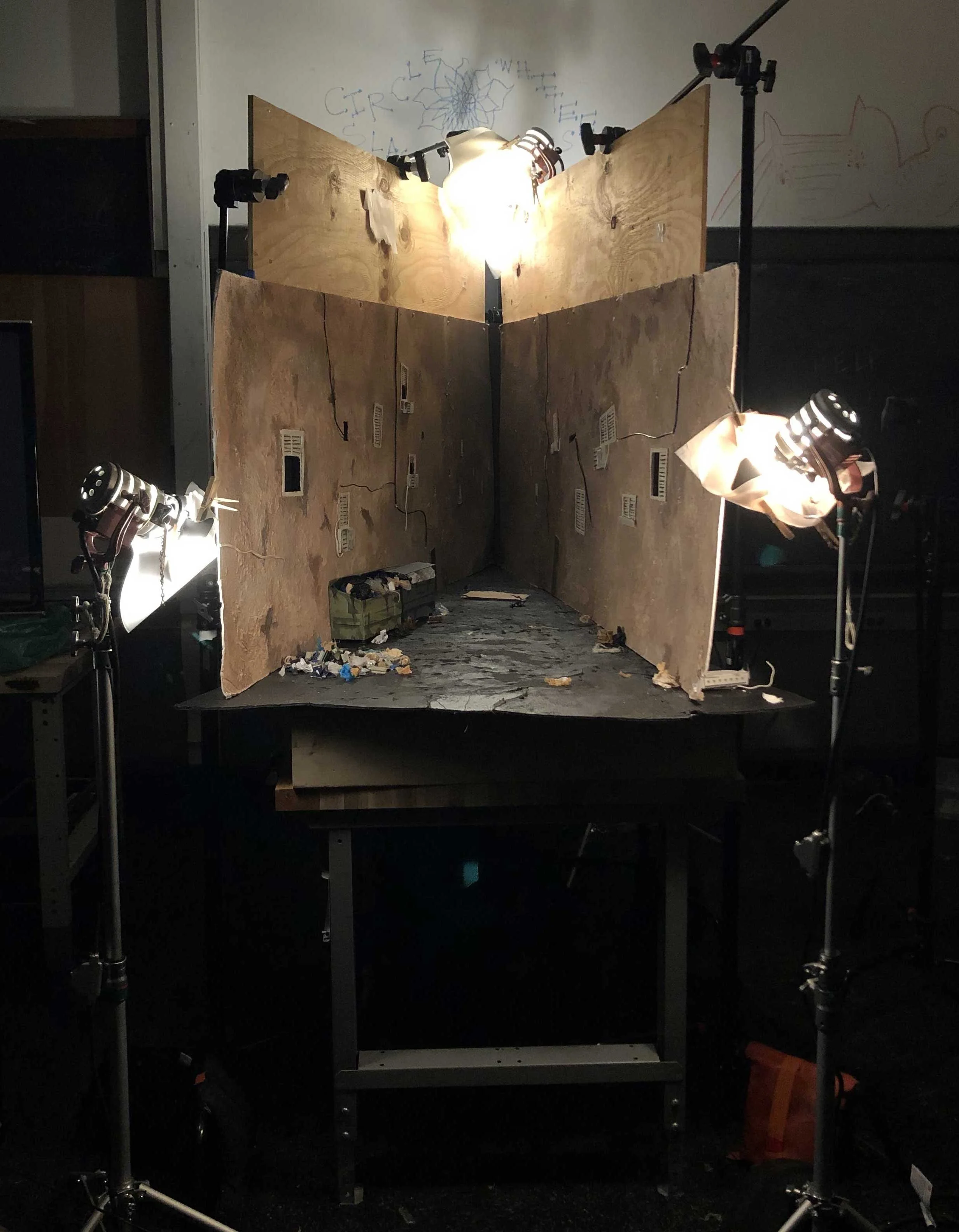 SETS - Alleyway (32x80"): joint compound, handmade paper, sand + plaster + concrete texture medium & acrylic on foam core for pavement; Beach: leather & sand for shore, plastic wrap for water
