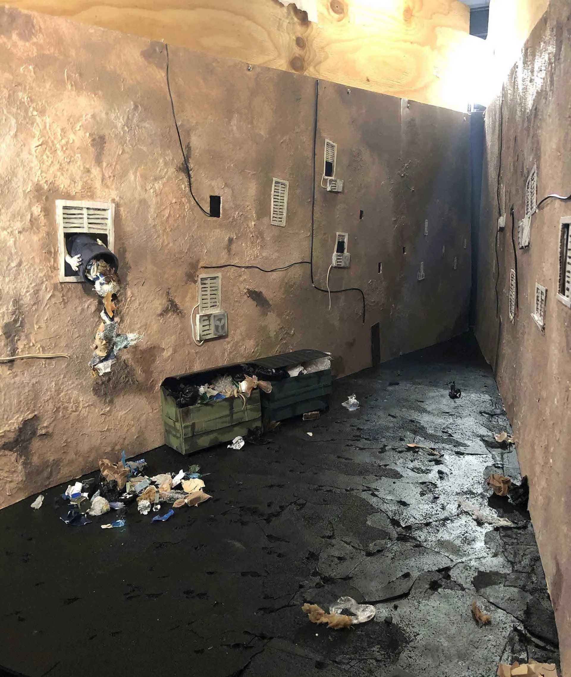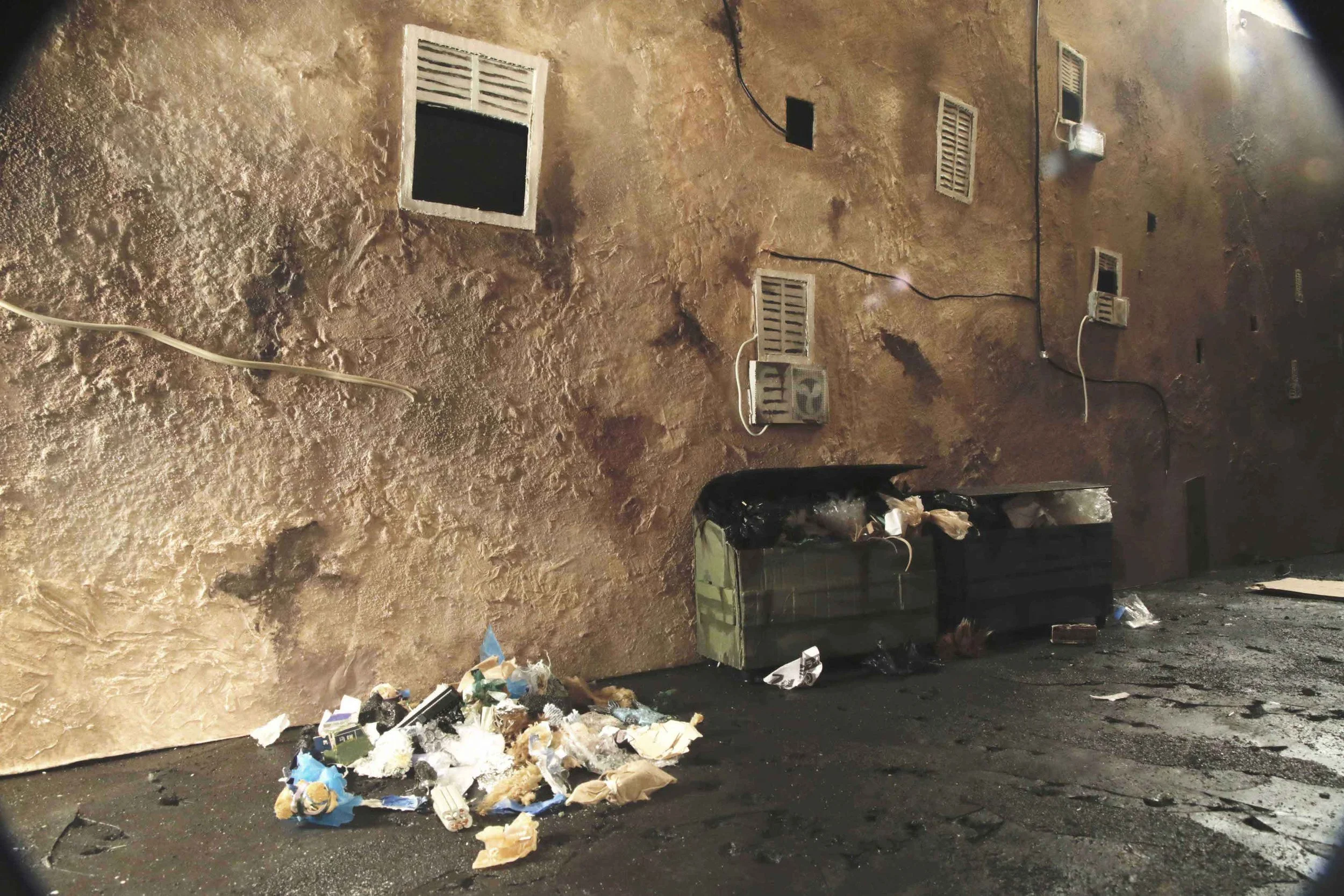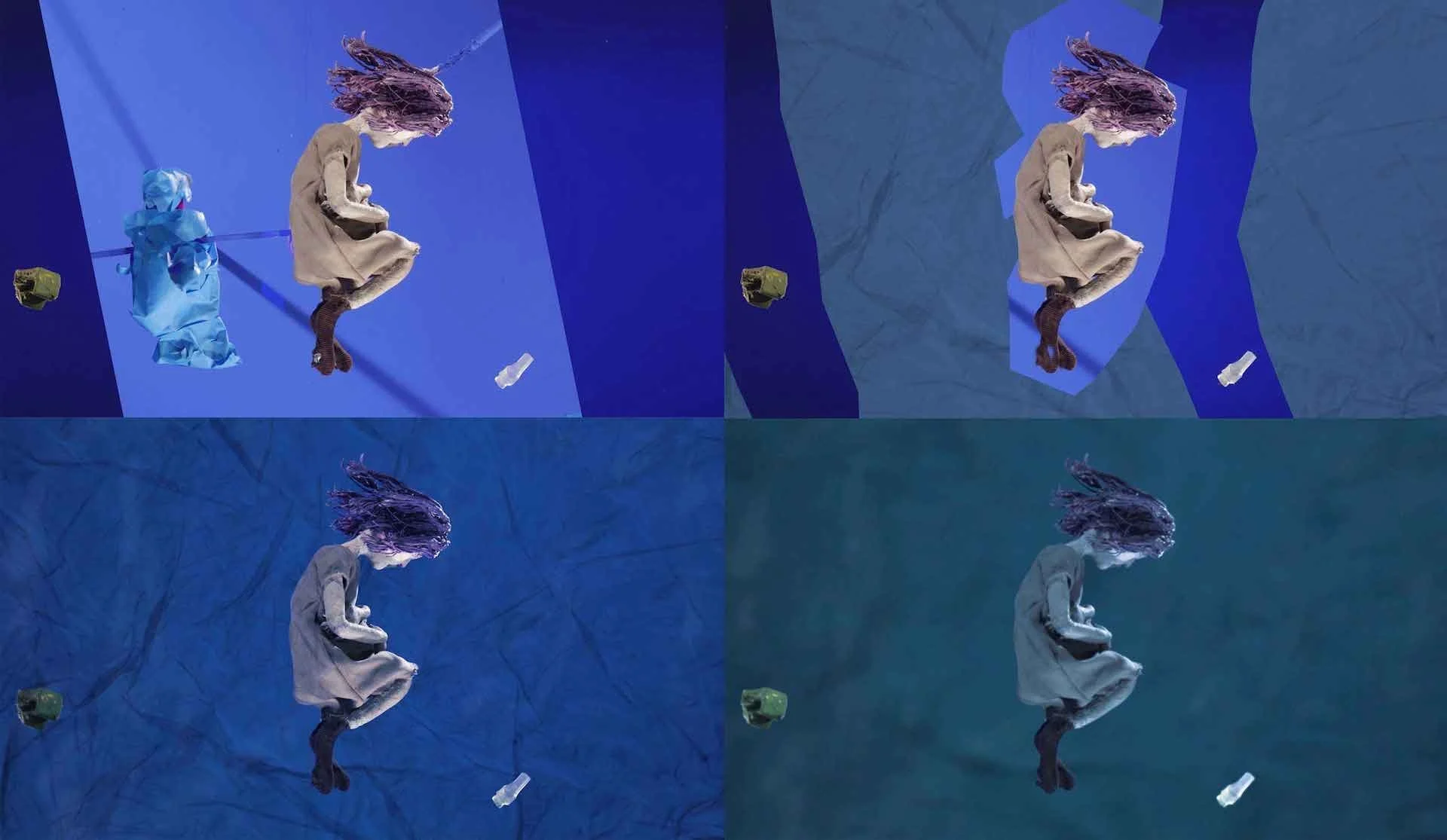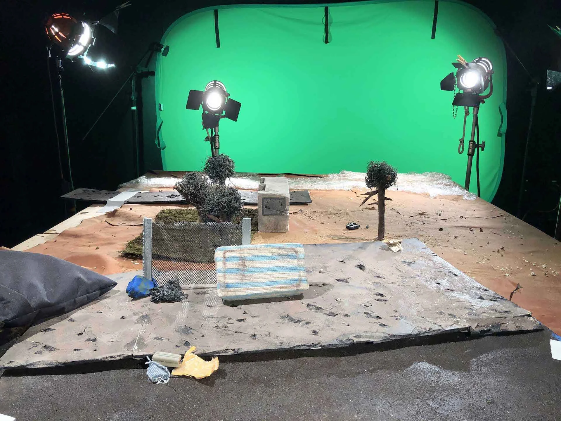 SETS - Alleyway (32x80"): joint compound, handmade paper, sand + plaster + concrete texture medium & acrylic on foam core for pavement; Beach: leather & sand for shore, plastic wrap for water
