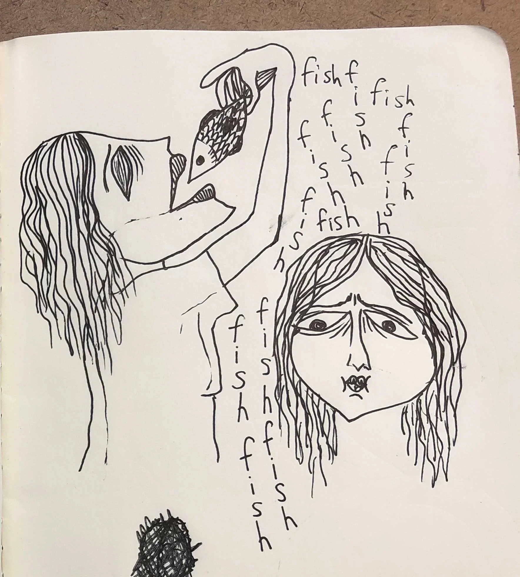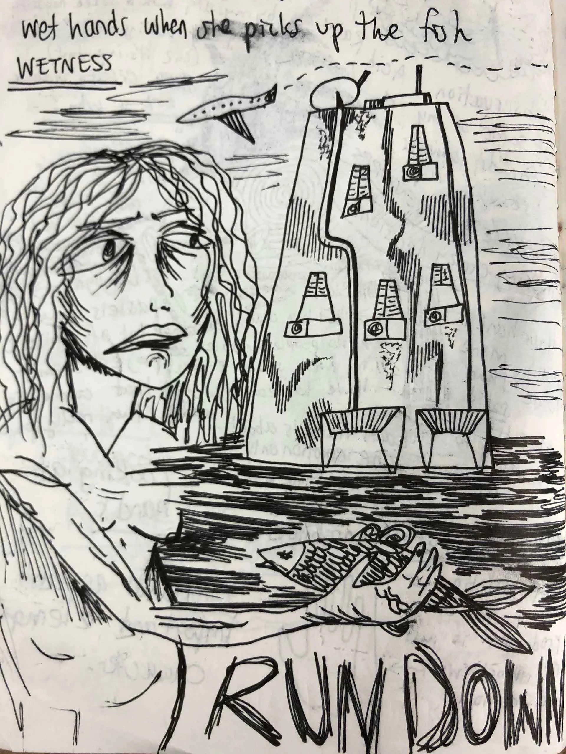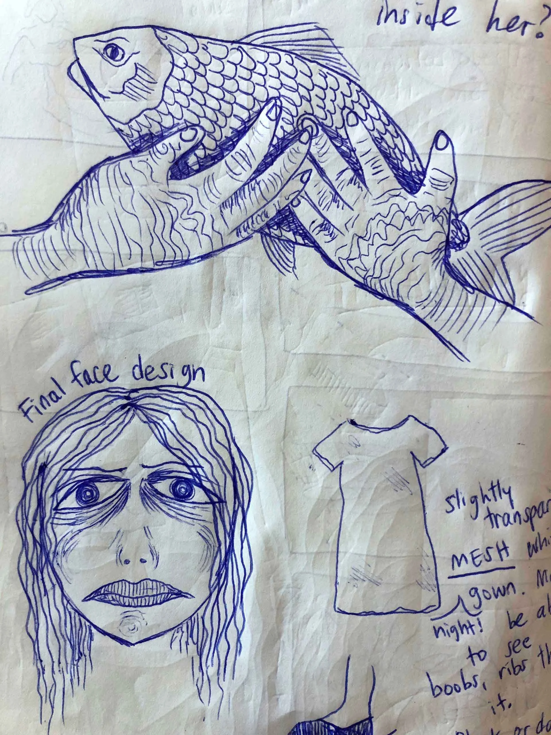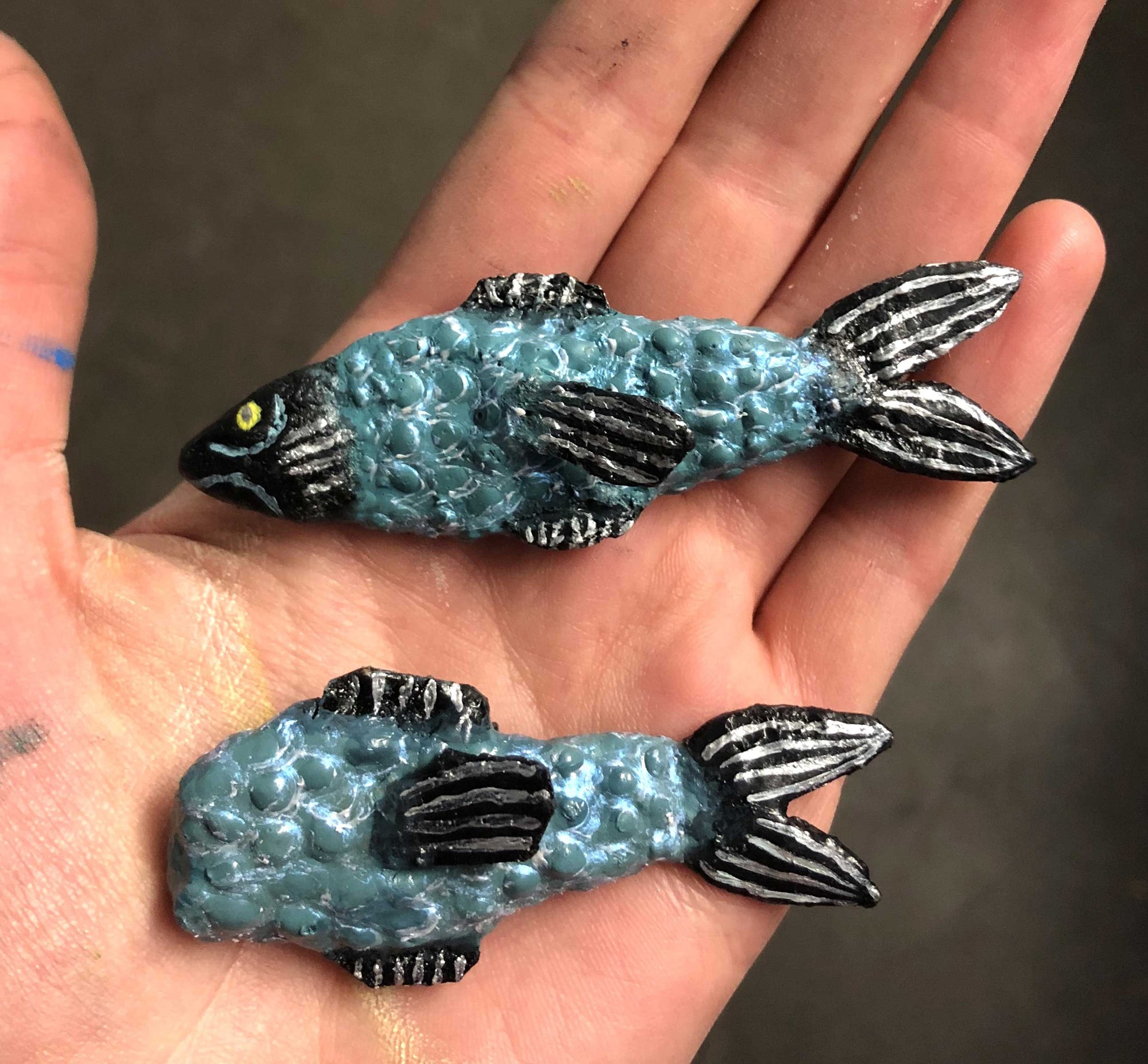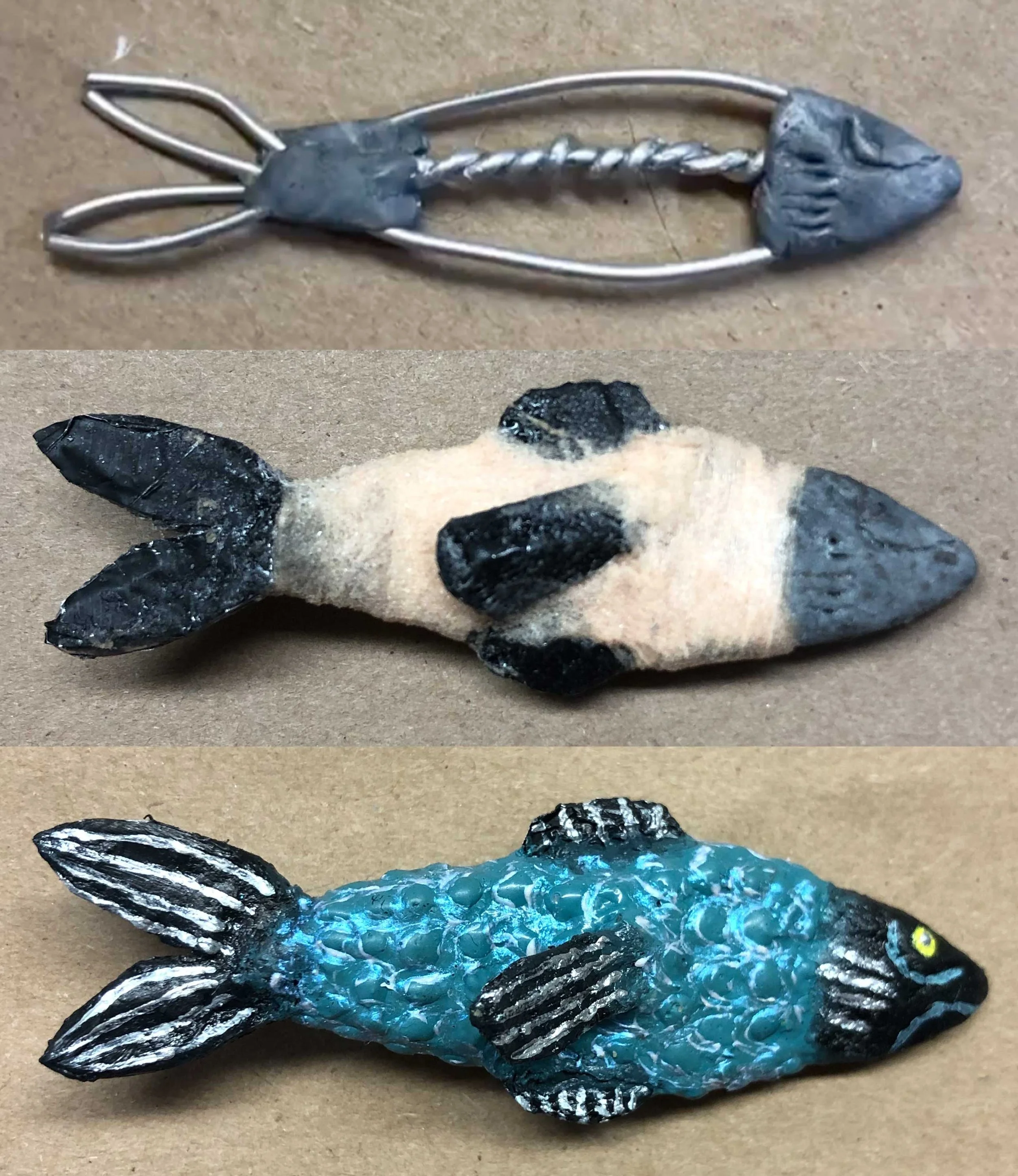 Fish puppet: wire armature, foam, bandages, ProPoxy, latex & acrylic skin, Cinefoil moveable fins
